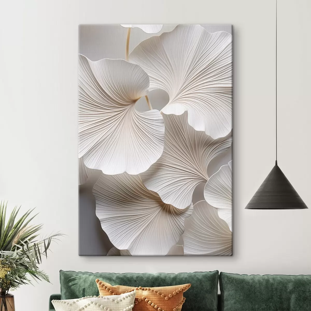 Obraz Bílé listy ginkgo biloba s detailními žilkami, jemným osvětlením, texturovaným elegantním a minimalistickým designem Č. s46705