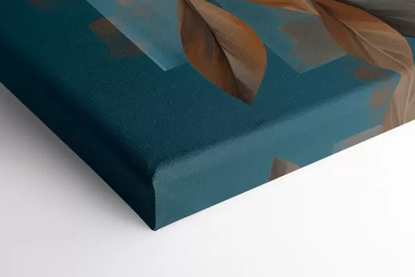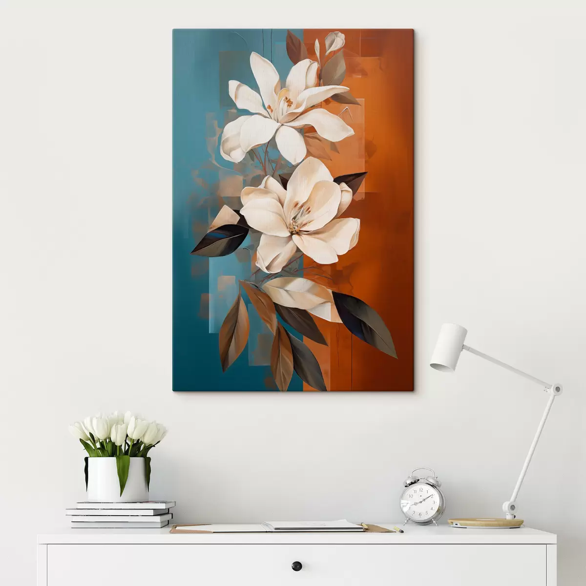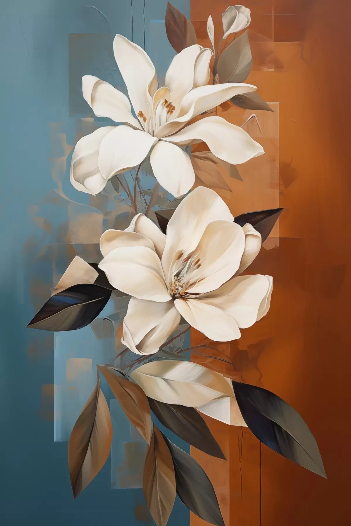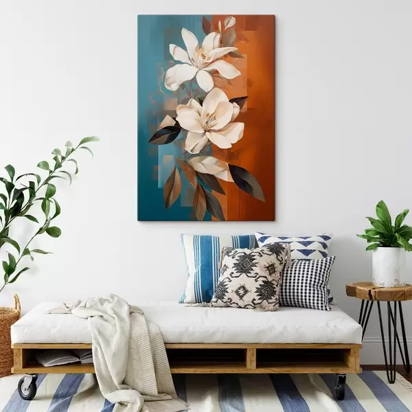 Obraz Abstraktní bílé květy a listy na hnědém a modrém pozadí s abstraktními tvary, v minimalistickém stylu Č. s46710