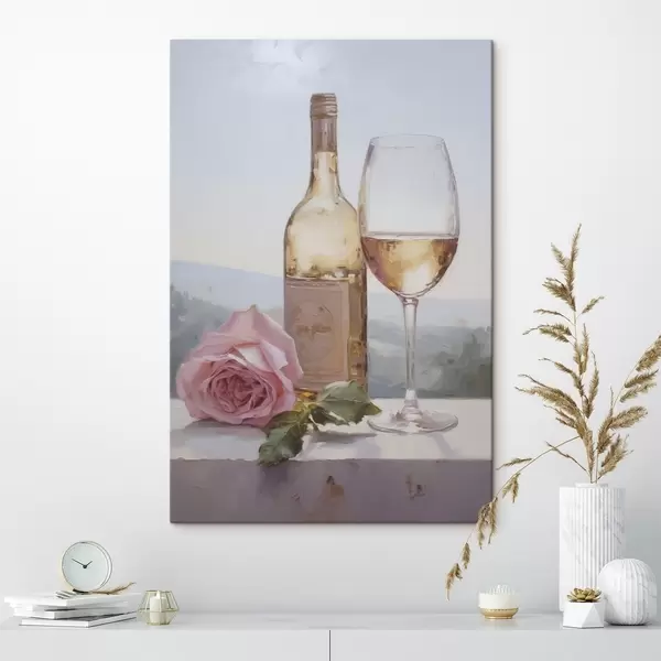 Obraz Láhev a sklenice vína a malý pes s brýlemi, imitace malby Č. s46721