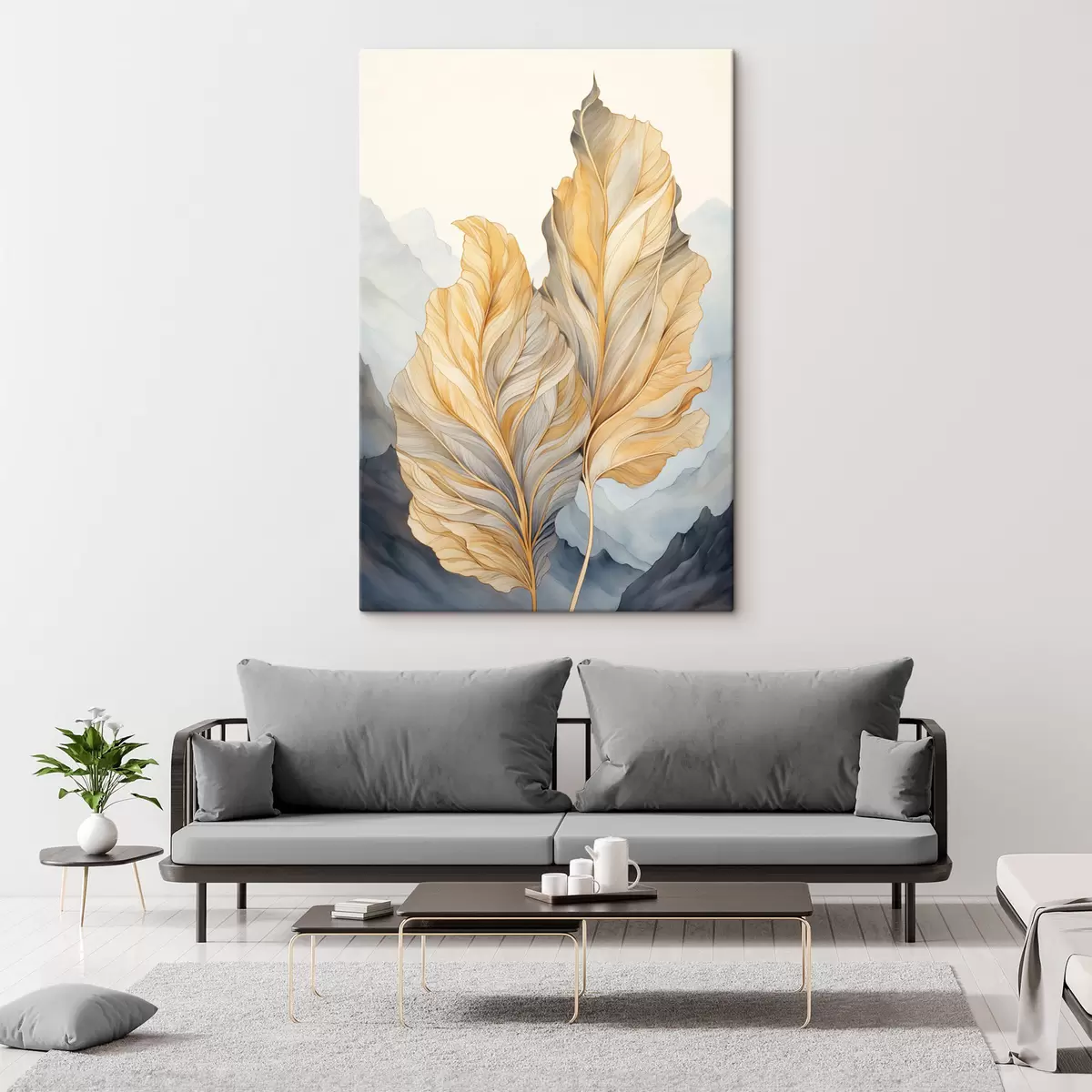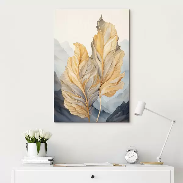 Obraz Abstraktní velké žluté a hnědé listy se složitými detaily na pozadí horské krajiny Č. s47023