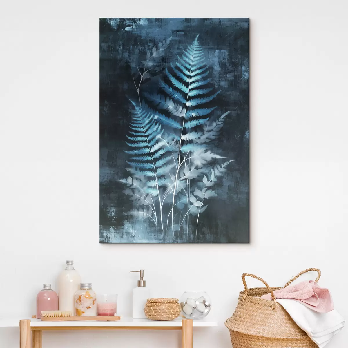 Obraz Modré kapradiny a rostliny na tmavém, strukturovaném pozadí, s důrazem na složité detaily, rentgenový efekt Č. s47026