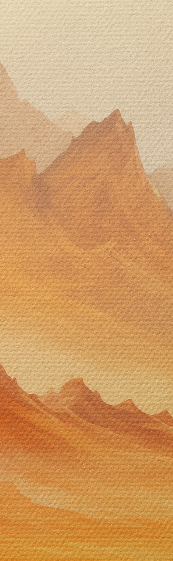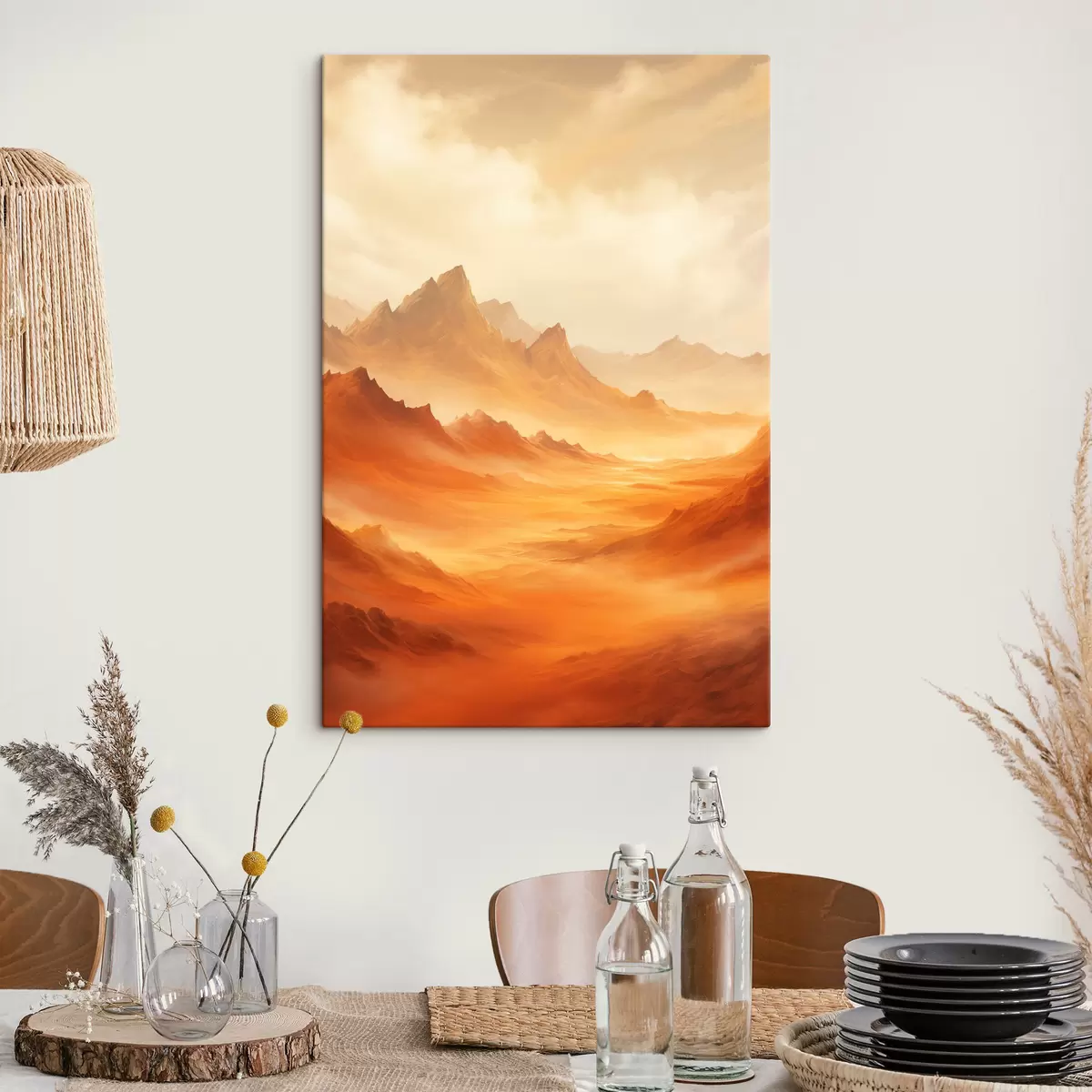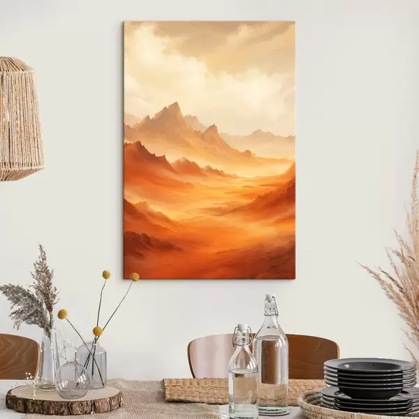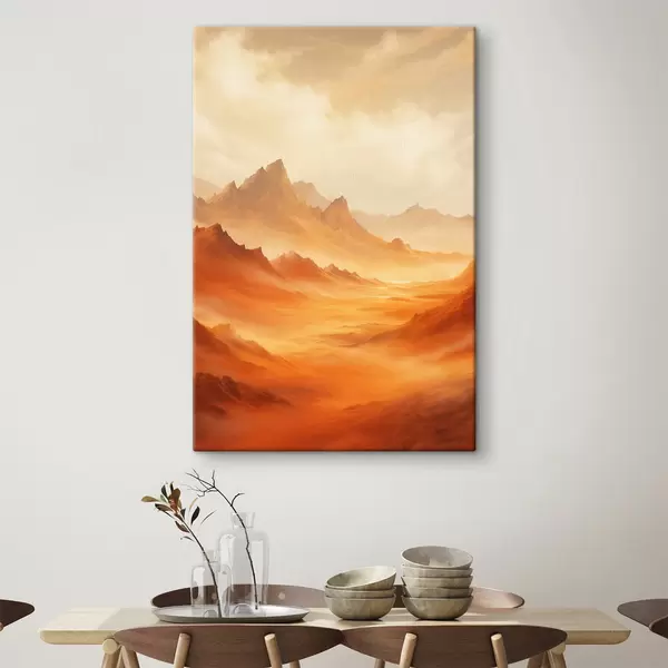 Obraz Rozlehlá oranžová pouštní krajina s vysokými skalnatými horami pod zamlženou, sluncem zalitou oblohou s řídkými mraky. Č. s47029