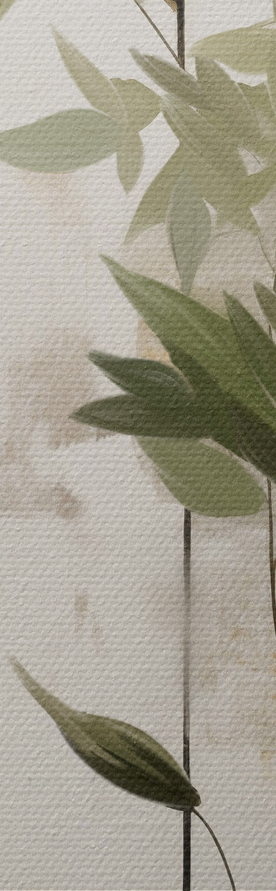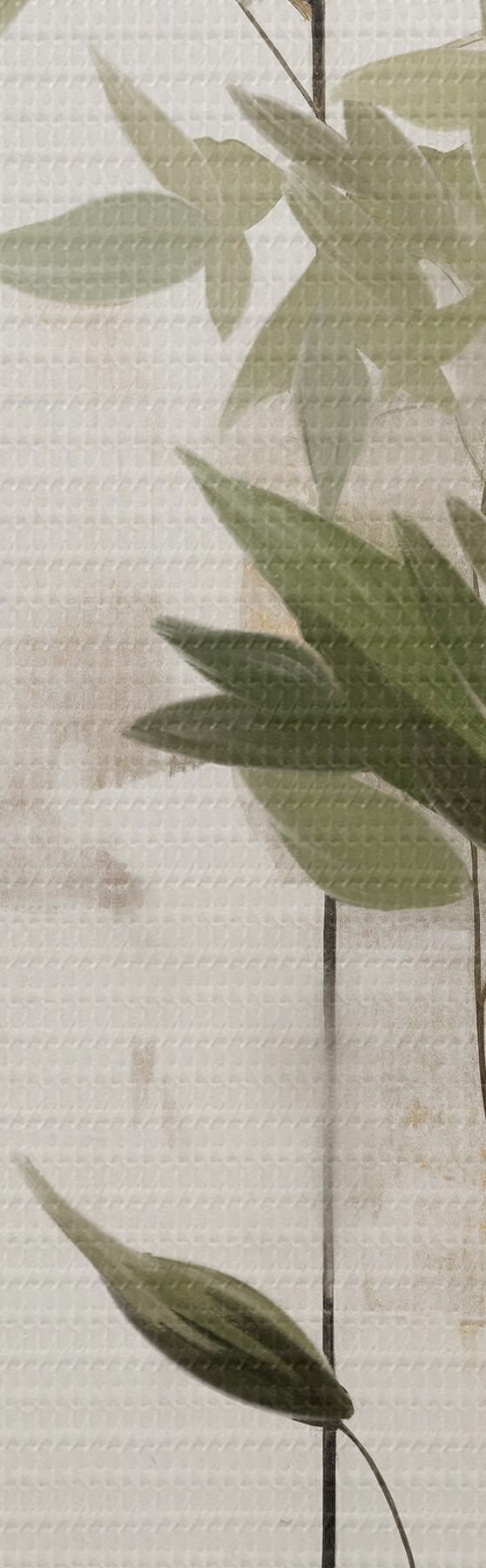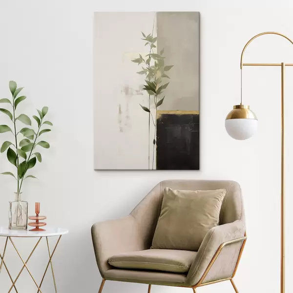 Obraz Minimalistický texturovaný obraz vázy se zelenými listy na pozadí abstraktních geometrických tvarů. Č. s47037