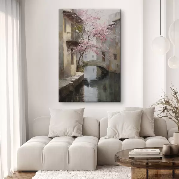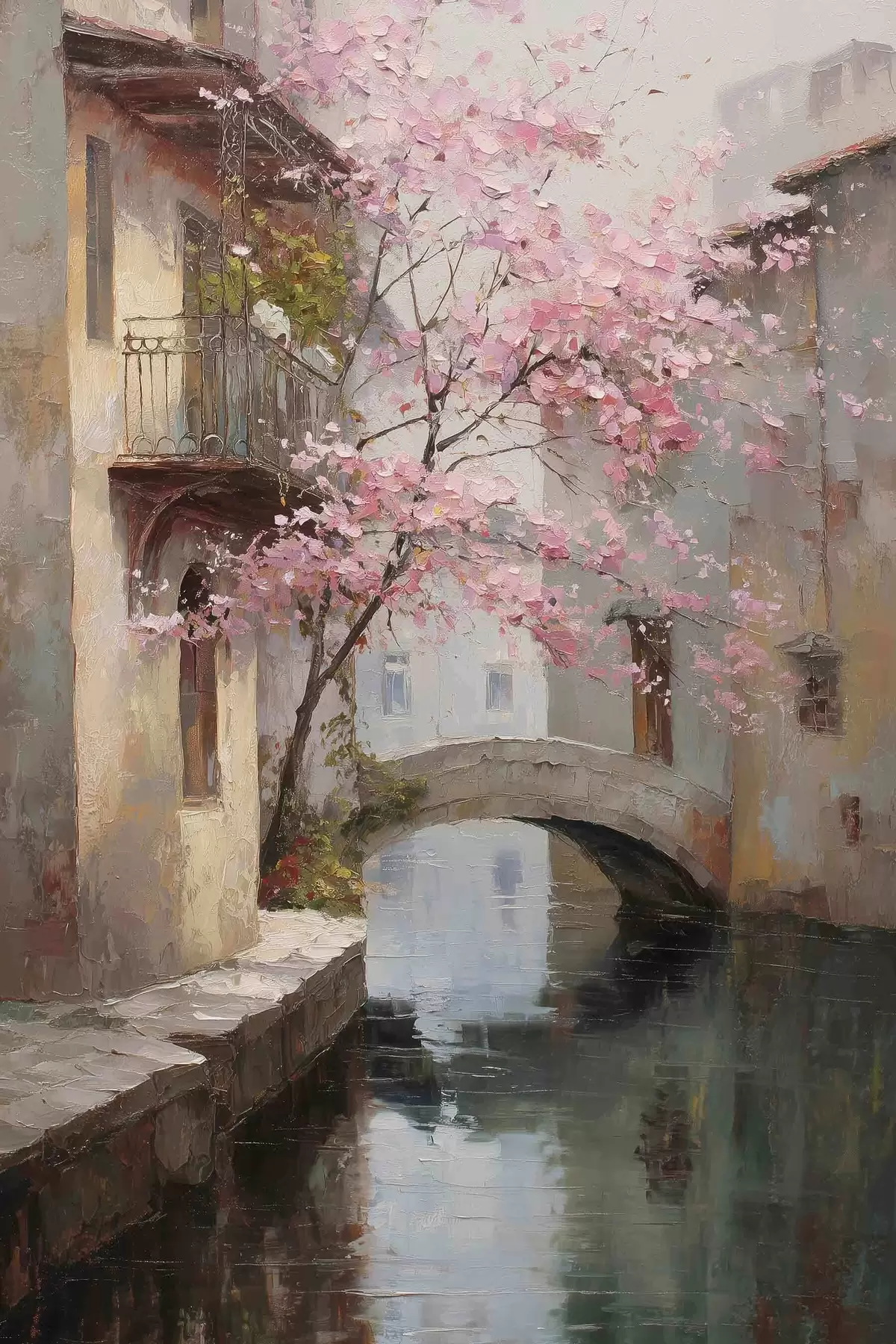 Obraz romantický městský pohled s rozkvetlým stromem ve stylu olejomalby Č. s47126