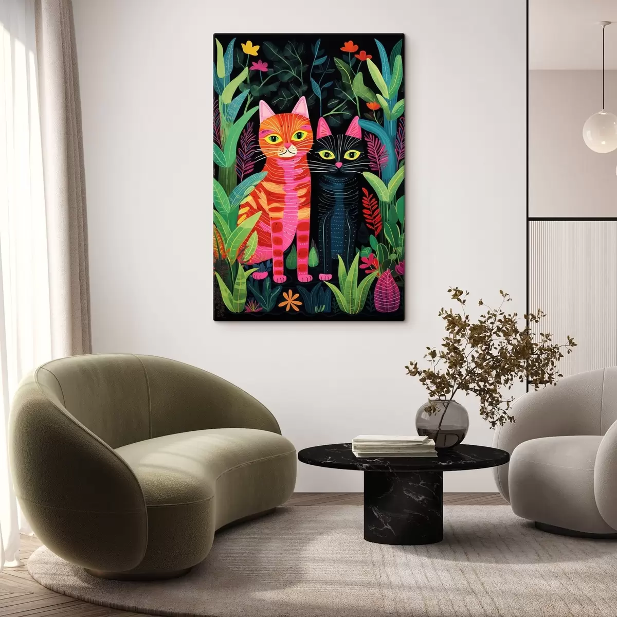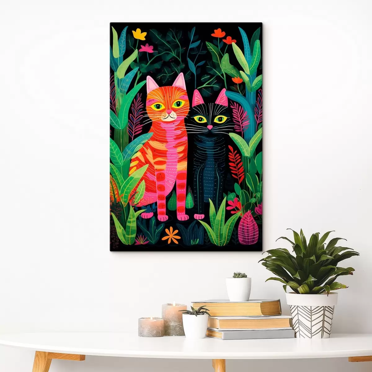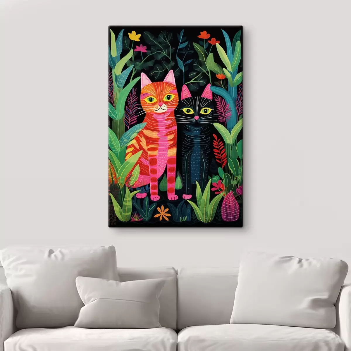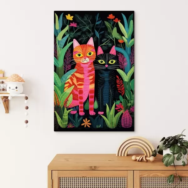 Obraz Dvě stylizované kočky mezi živými rostlinami Č. s47298