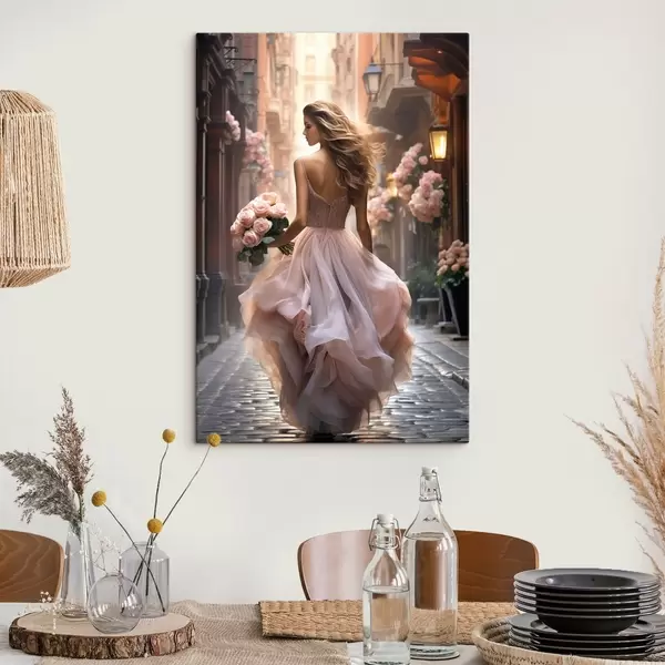 Obraz Žena v růžových šatech kráčející po ulici Č. s47316