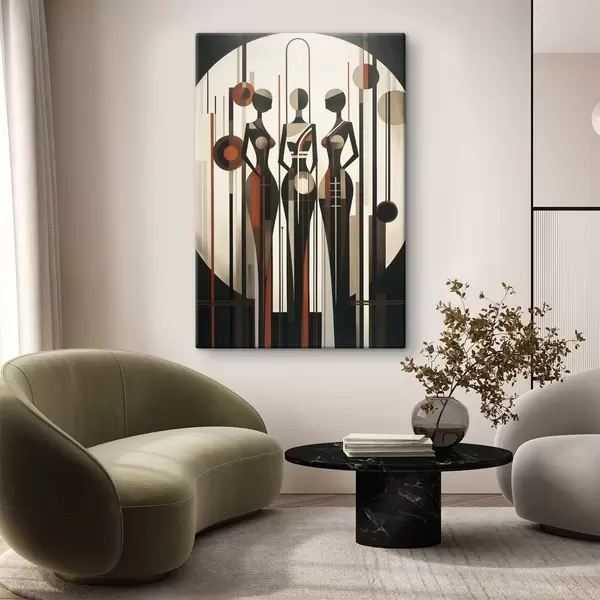 Obraz Stylizované ženské postavy s geometrickými prvky na abstraktním pozadí vertikálních čar a kruhů Č. s47422