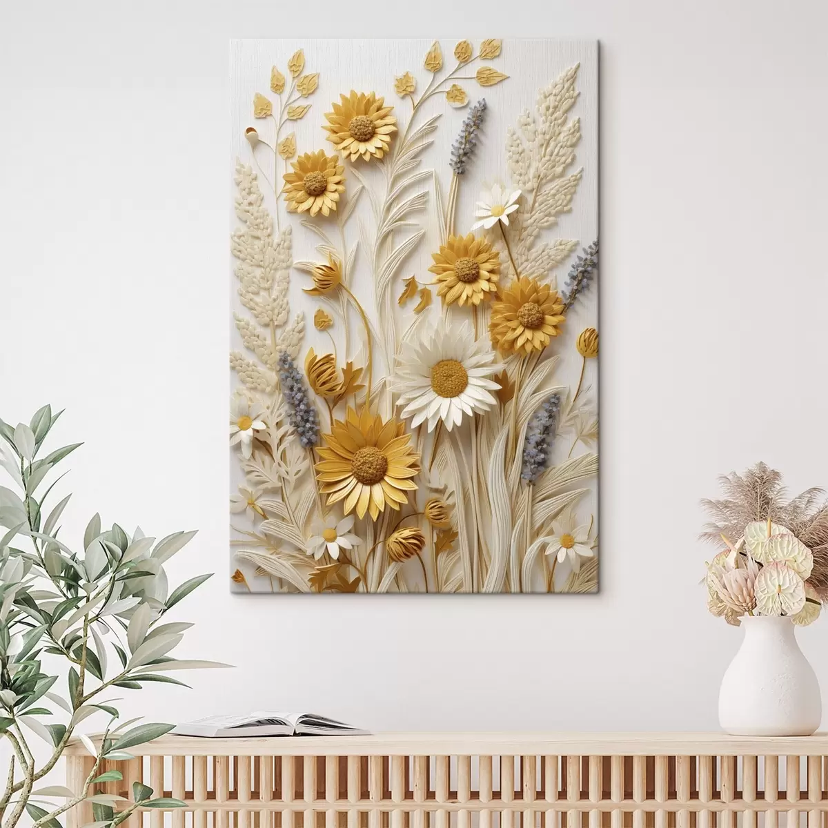 Obraz Texturovaná kolekce žlutých a bílých sedmikrásky se sušenými trávami a levandulovými větvičkami na bílém pozadí Č. s47430