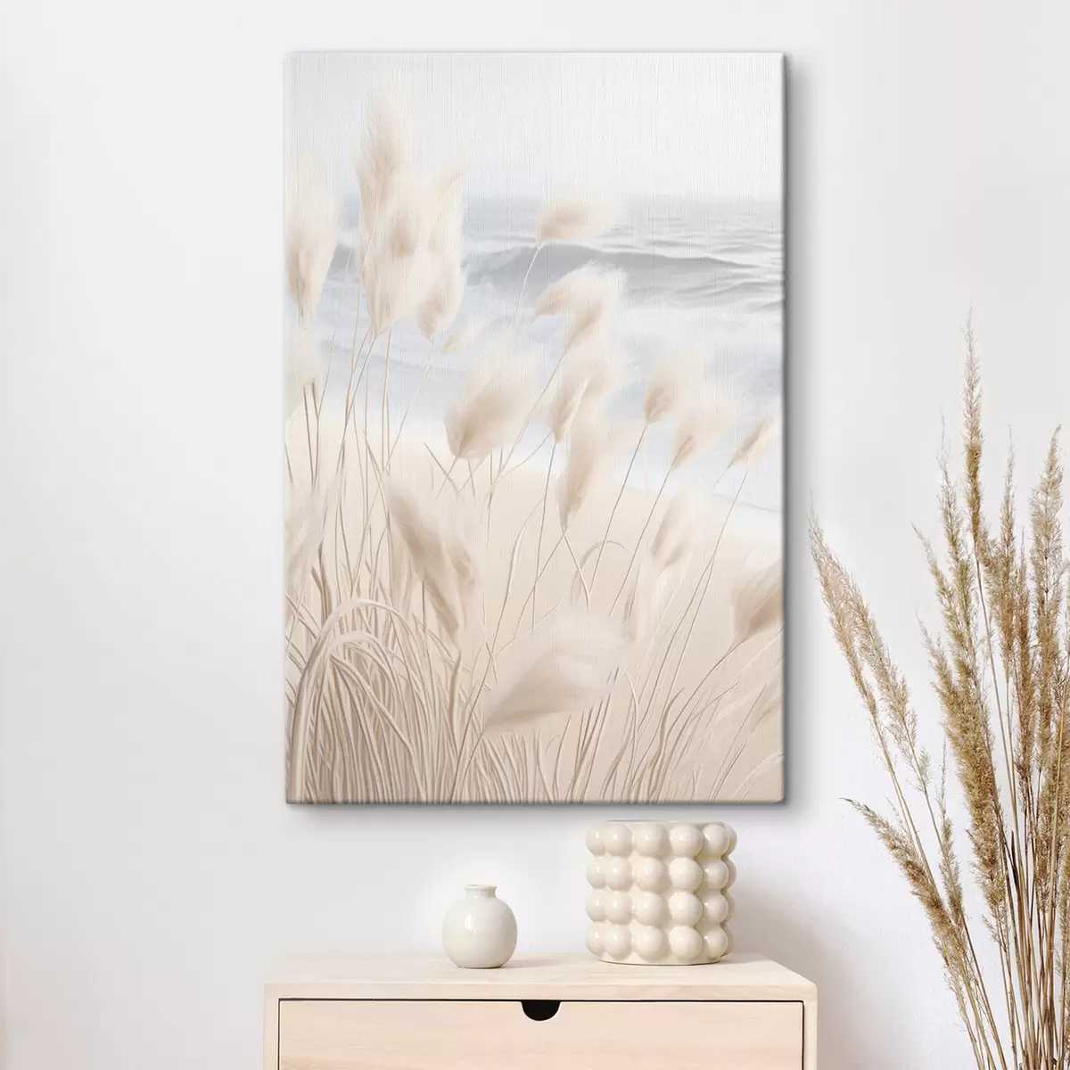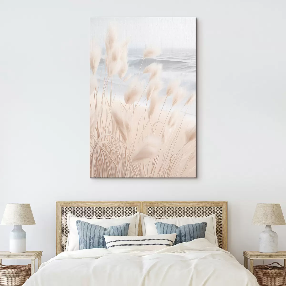 Obraz Vysoká, péřovitá tráva pampas v jemných béžových tónech v popředí, s písečnou pláží v pozadí Č. s47432