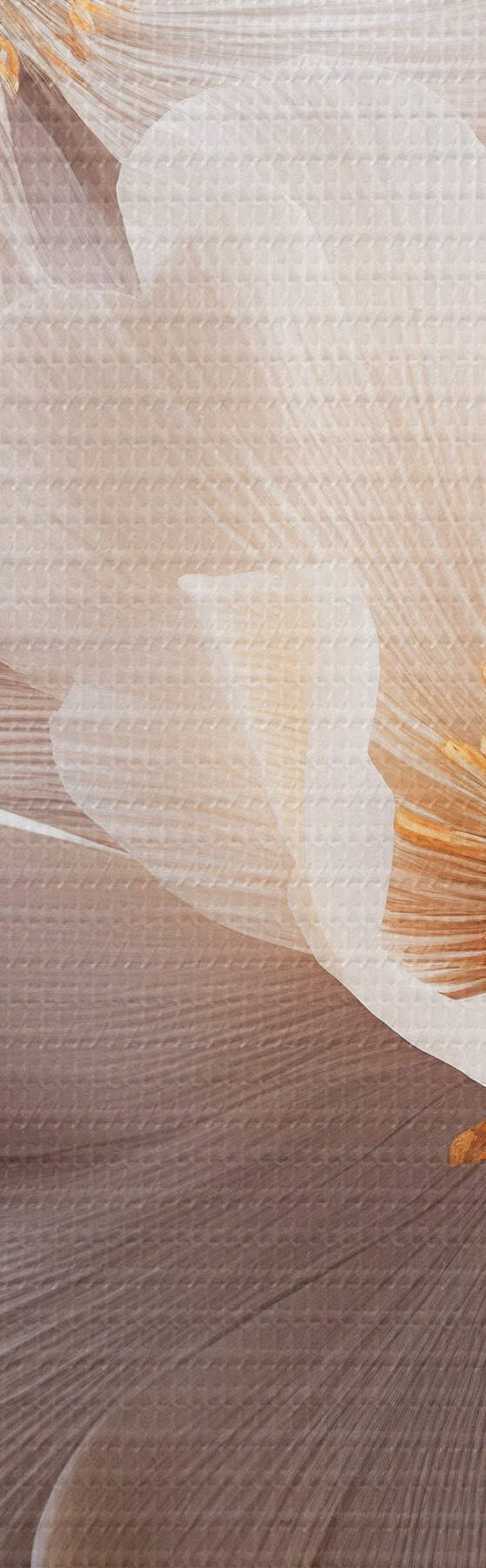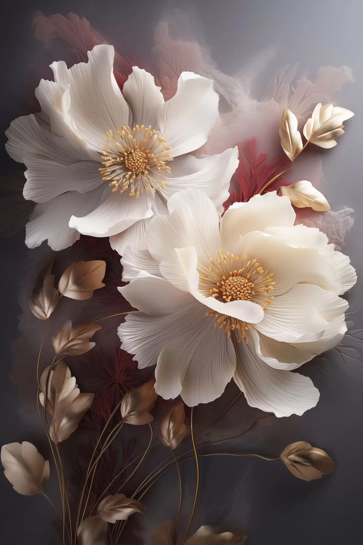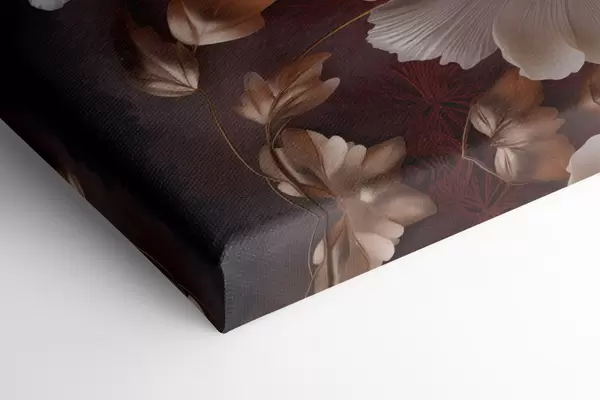 Obraz Jemné pivoňky s tenkými, jemnými okvětními lístky, obklopené tmavě červenými a žlutými listy na abstraktním pozadí Č. s47435