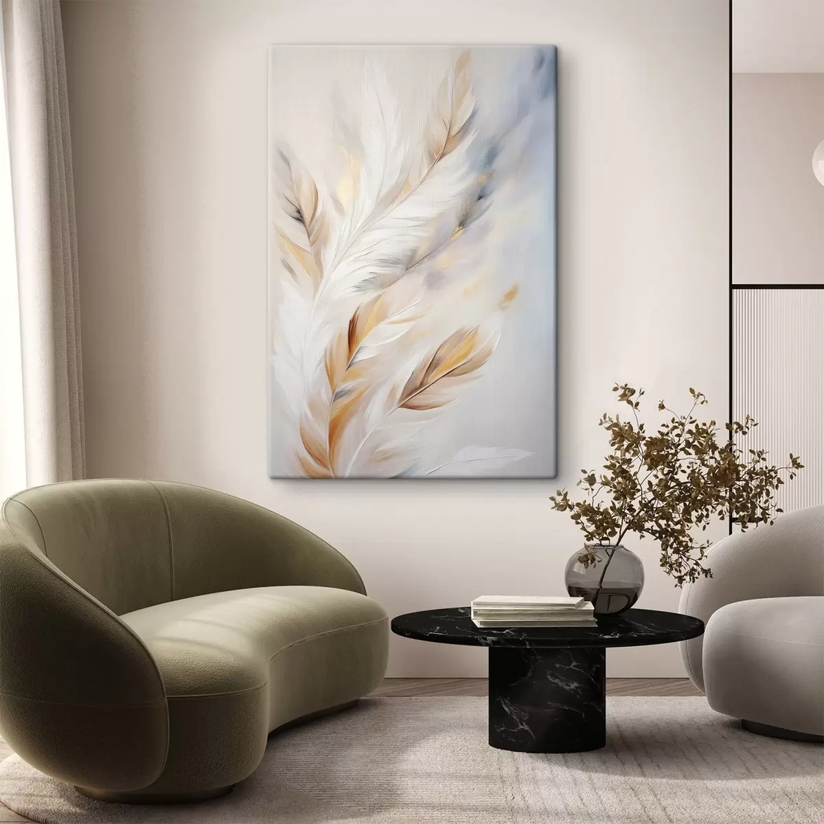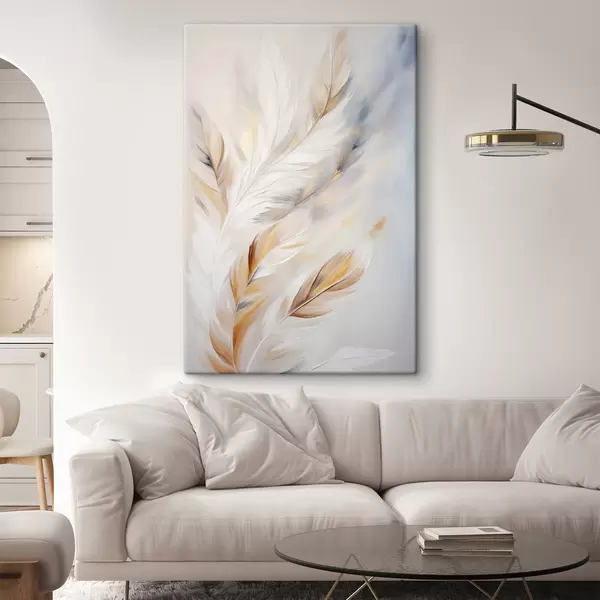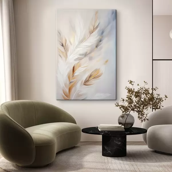 Obraz Velká, měkká peříčka v kombinaci bílé, žluté a hnědé barvy na světlém, abstraktním pozadí. Č. s47443