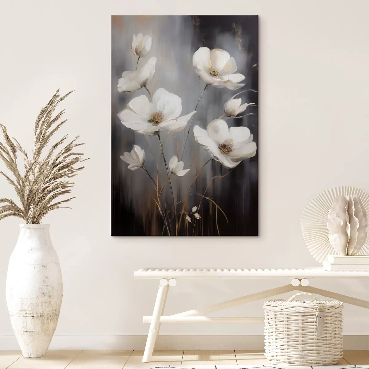 Obraz Bílé květy s hnědým středem a tenkými stonky na tmavém, strukturovaném pozadí Č. s47858