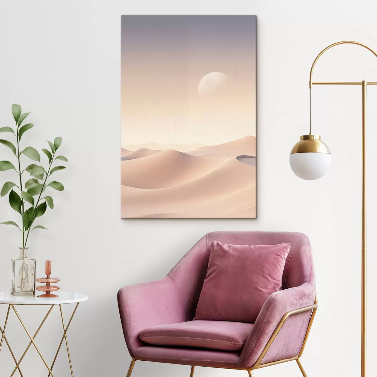 Obraz Pouštní krajina s vlnícími se písečnými dunami pod jemně pastelovou oblohou, v pozadí vzdálené hory Č. s47866