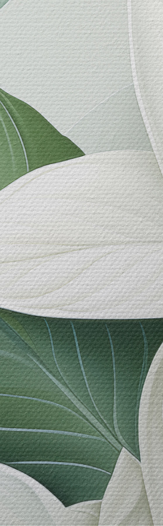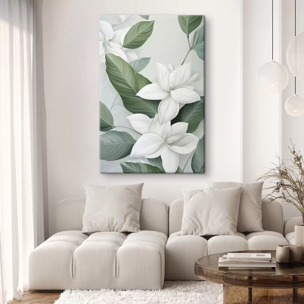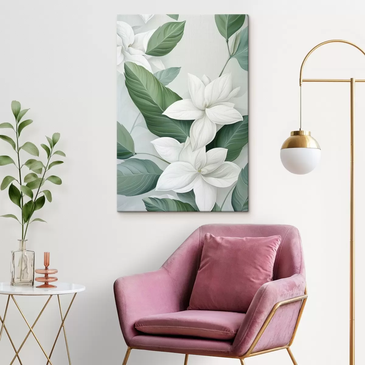 Obraz Bílé květy se zelenými listy, pastelové pozadí Č. s47869
