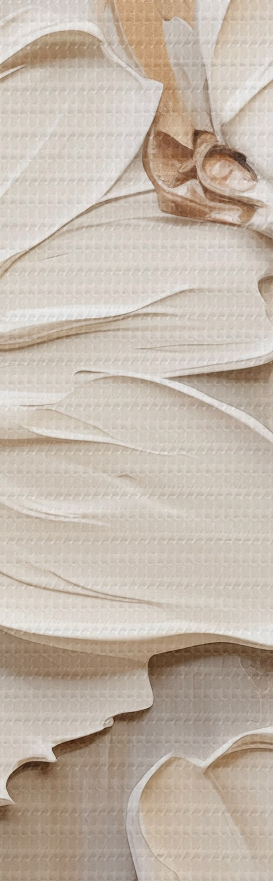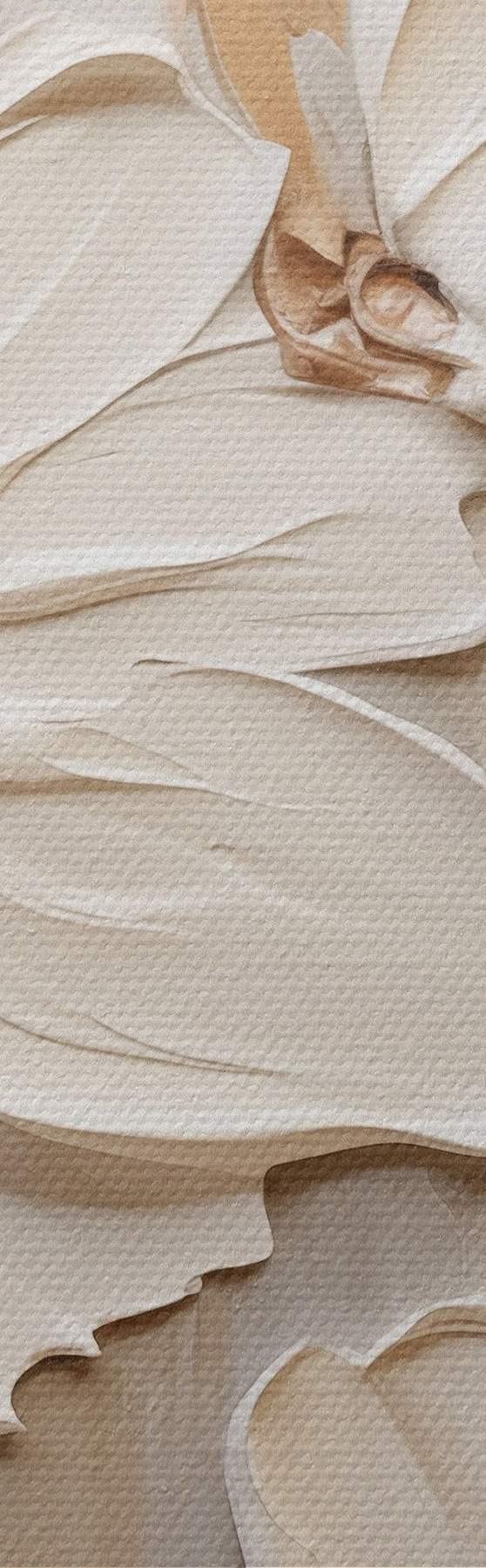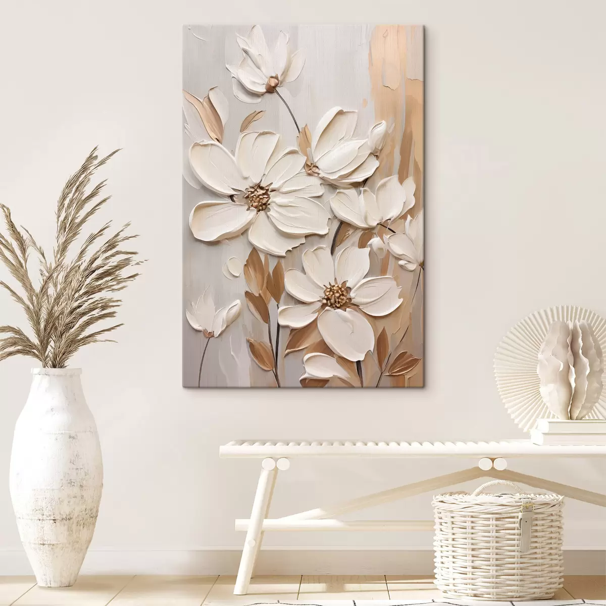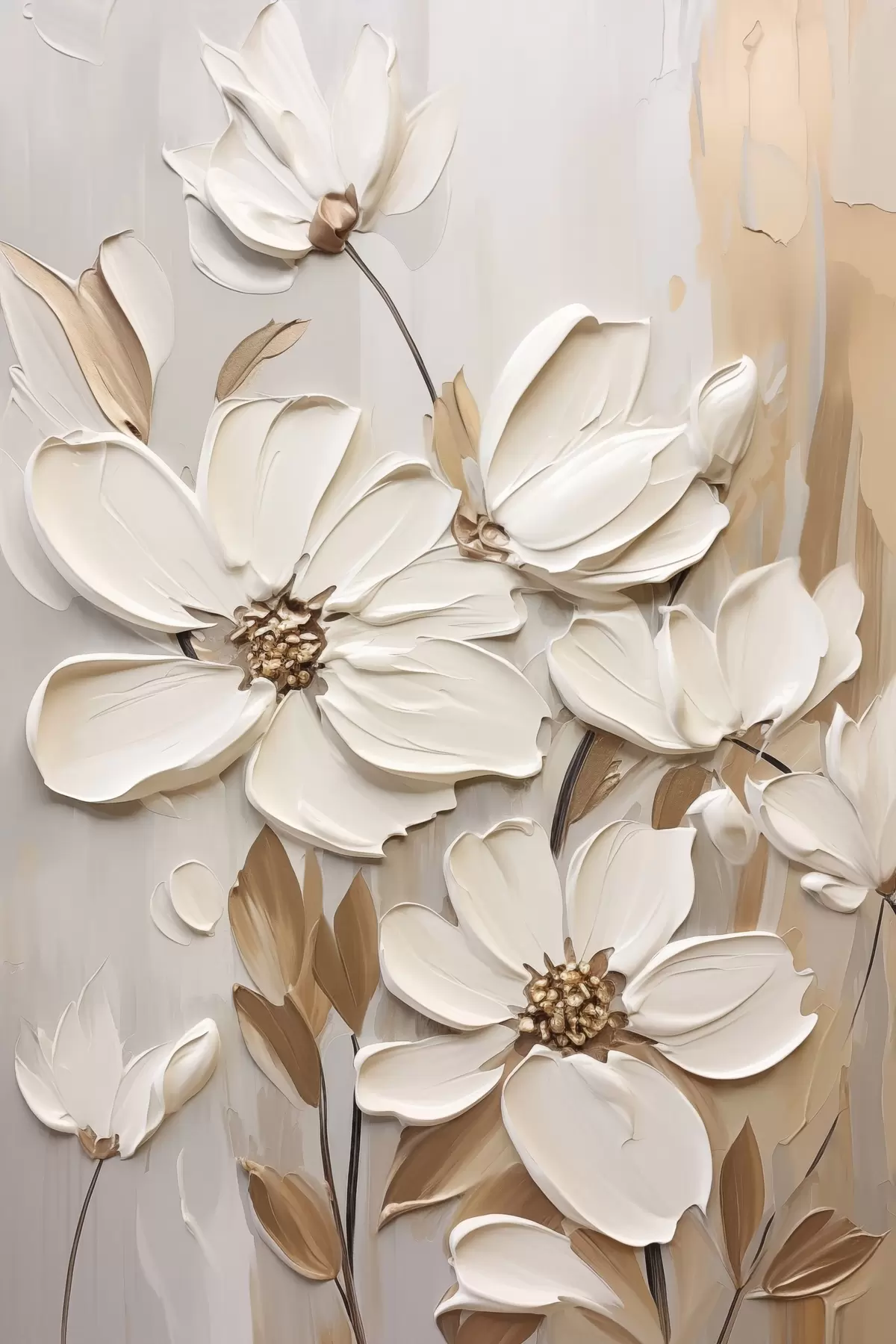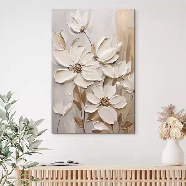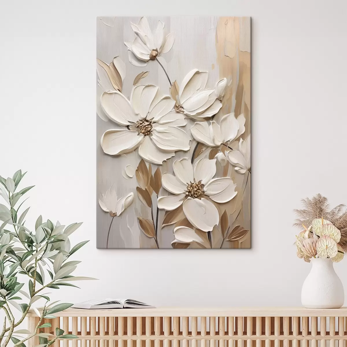 Obraz Abstraktní bílé květy s texturovanými okvětními lístky na neutrálním pozadí s jemnými tahy štětcem napodobujícími malbu. Č. s47873