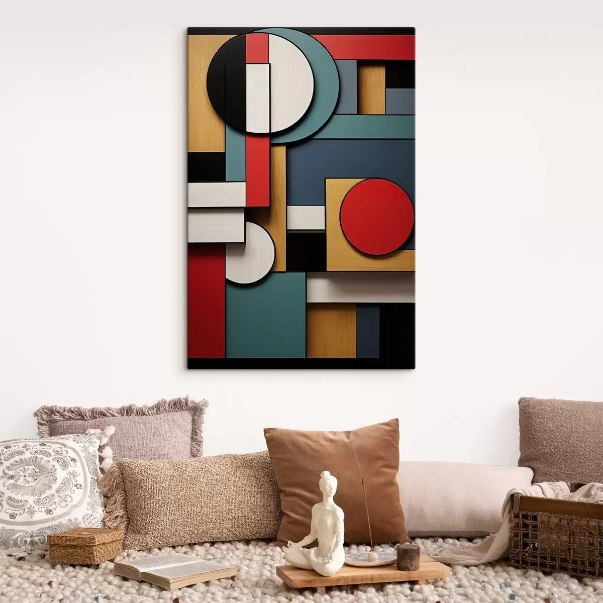 Obraz Abstraktní geometrická kompozice s imitací dřevěné textury, červenými, černými, bílými a modrozelenými obdélníky a kruhy Č. s47875