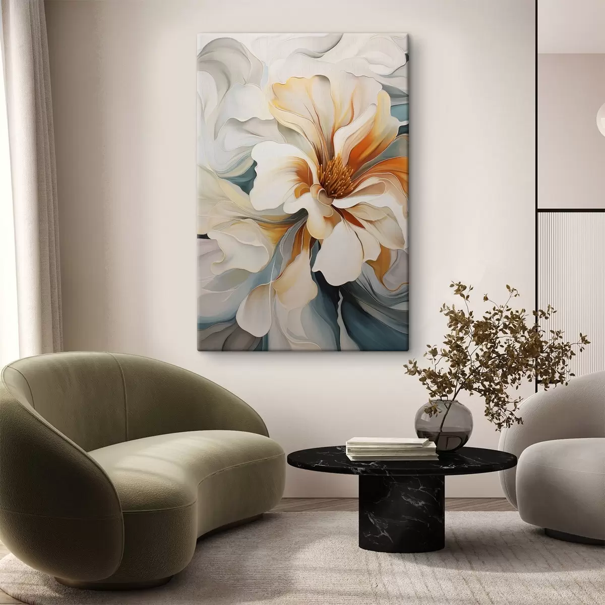 Obraz Abstraktní velký květ s bílými, oranžovými a tyrkysovými okvětními lístky, strukturované pozadí Č. s47877