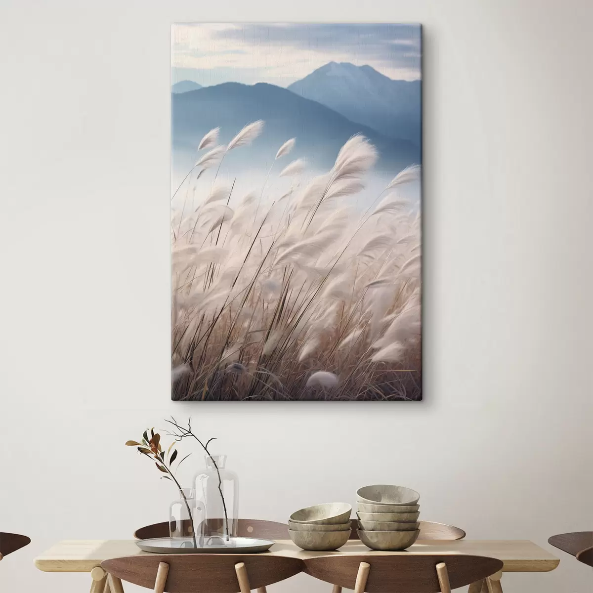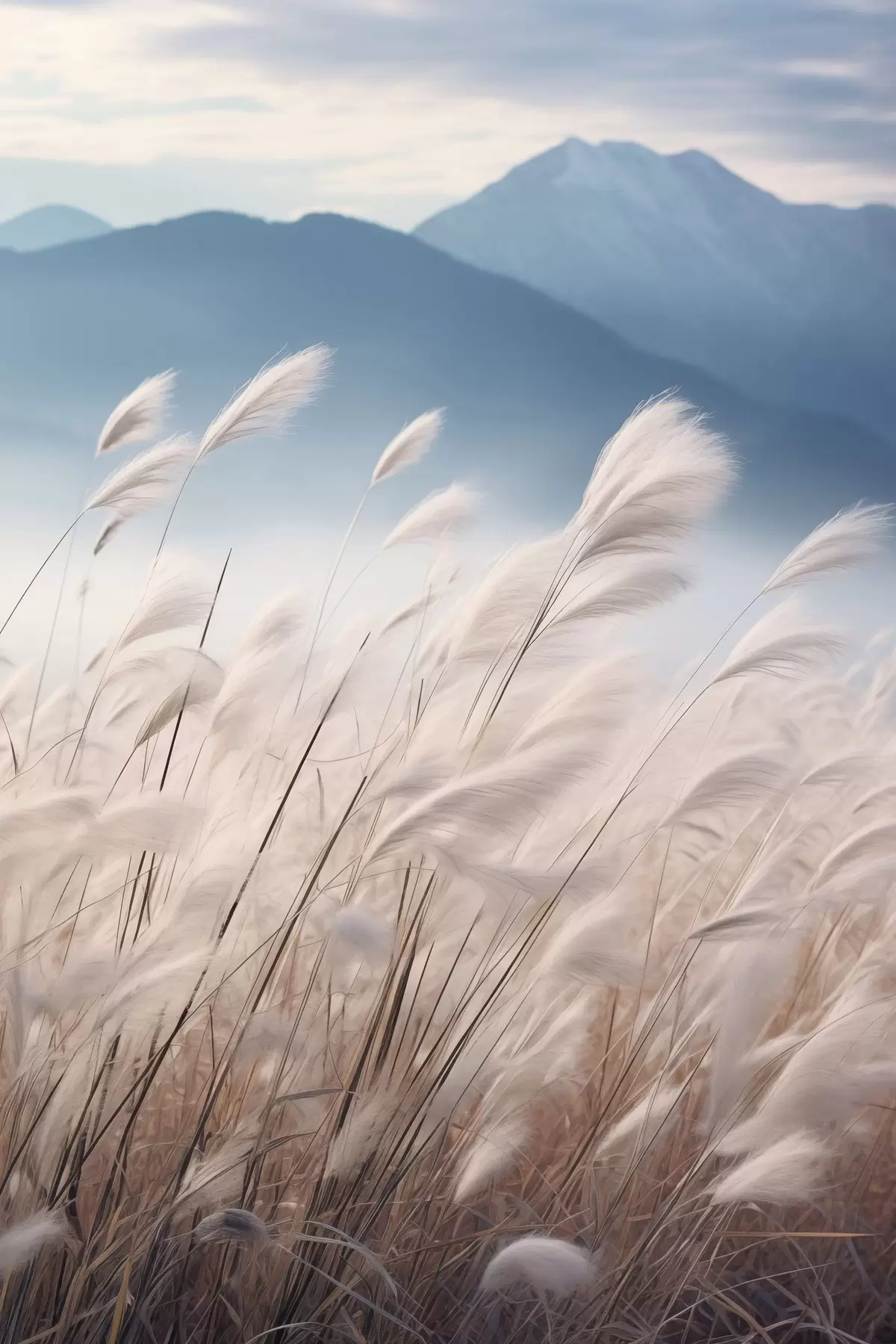 Obraz Vysoká bílá tráva pampasová vlající ve větru s jemně modrými horami v pozadí Č. s47879