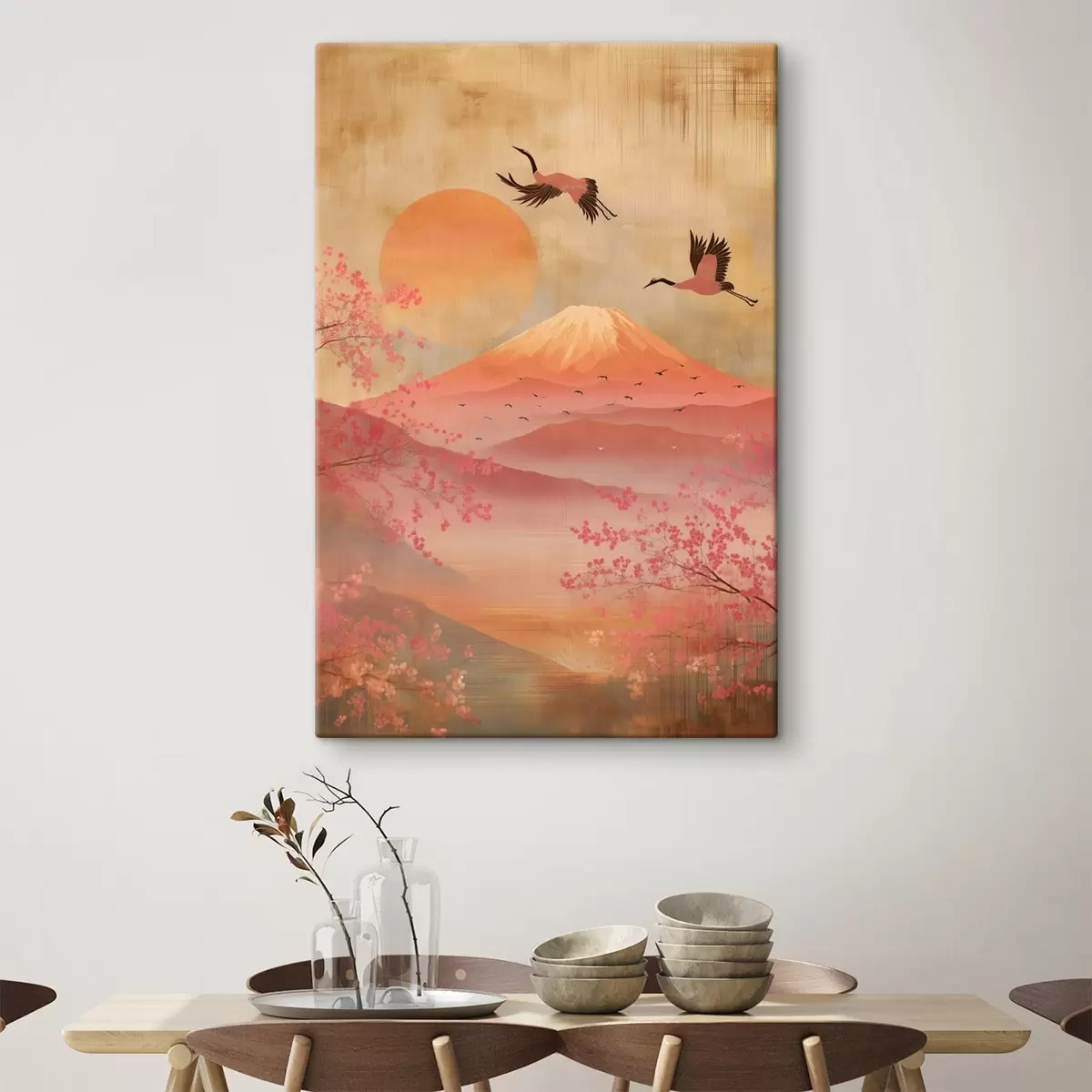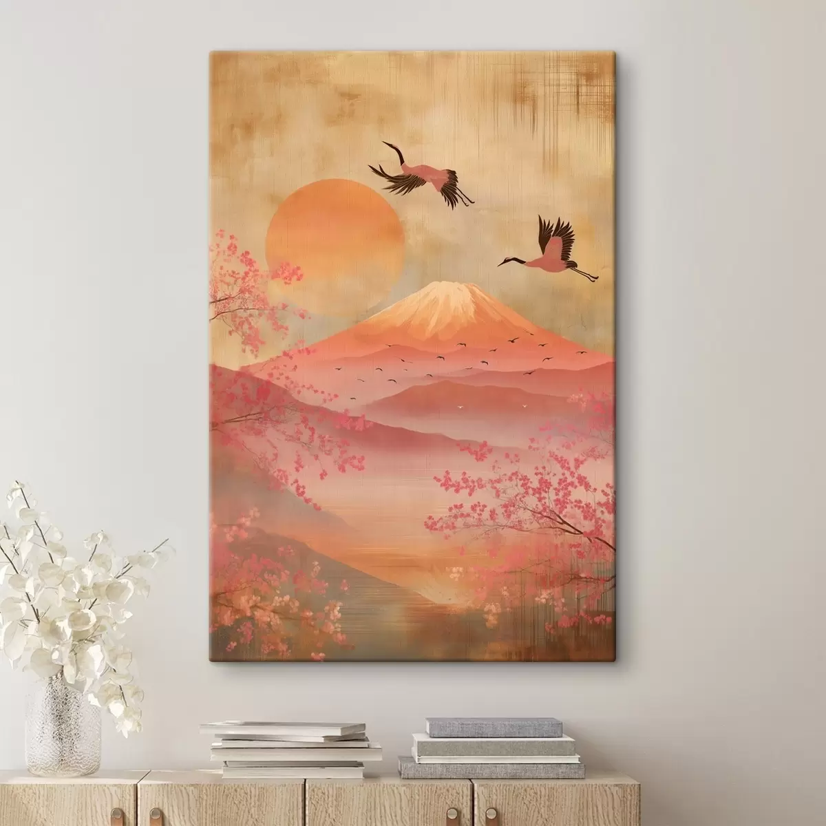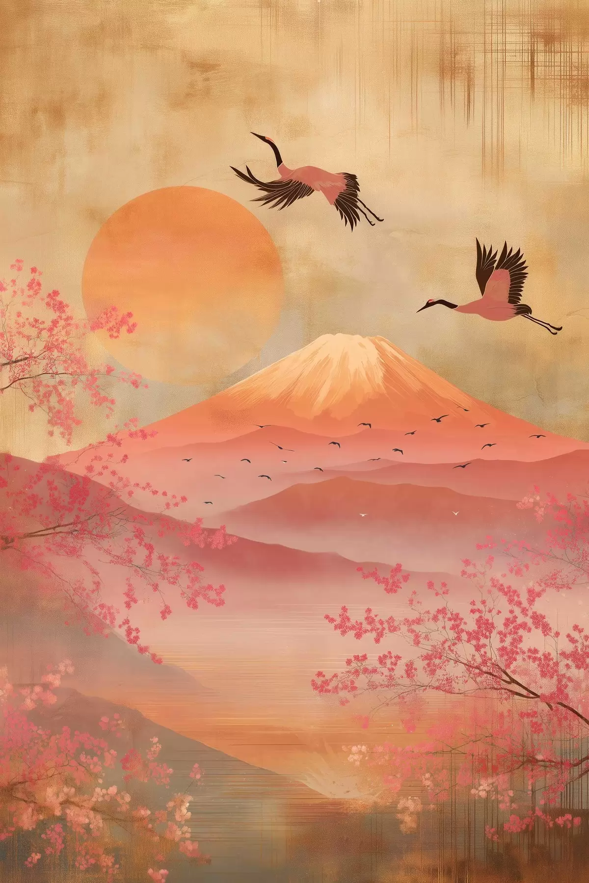 Obraz Jeřáby proti slunci a horám: ilustrace v digitálním uměleckém stylu Č. s47992