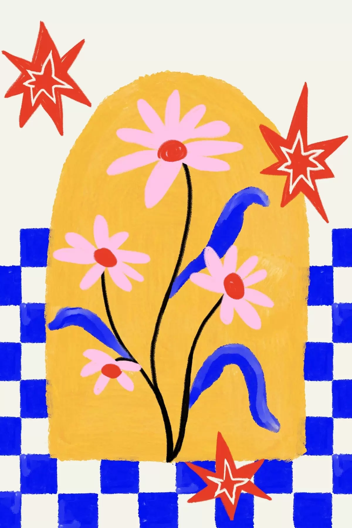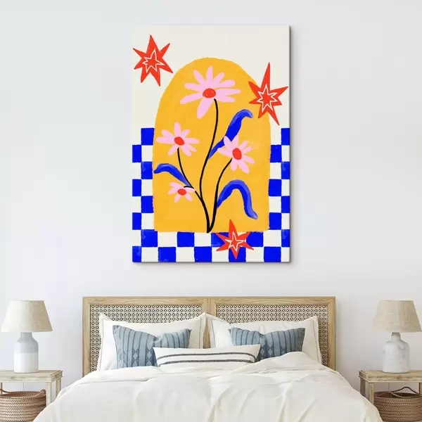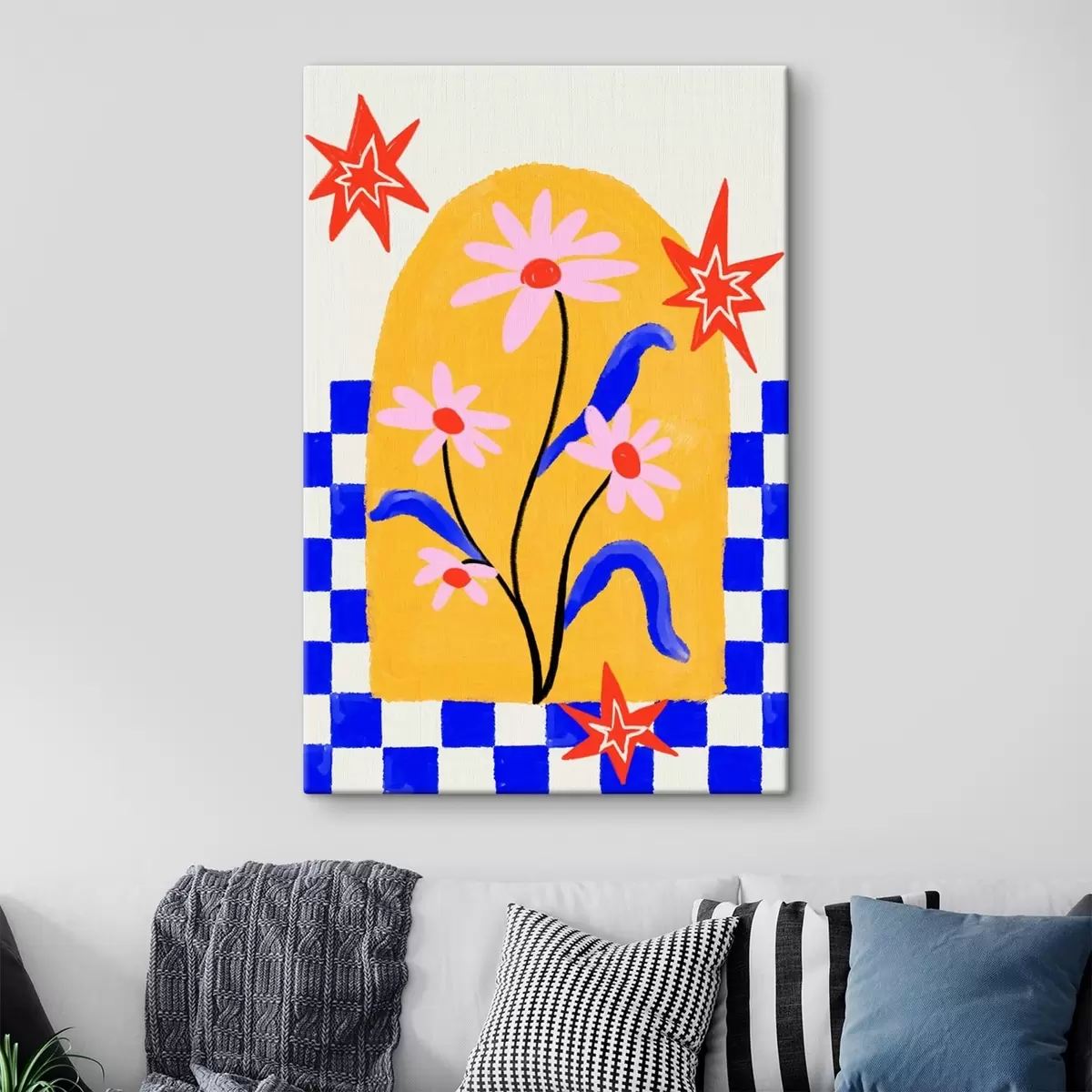 Obraz Zářivé květy na žlutém pozadí s modrým vzorem Č. s48034