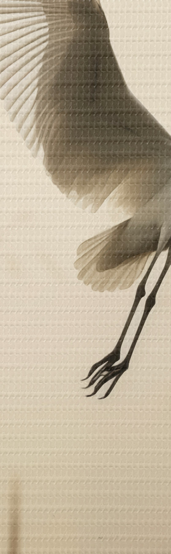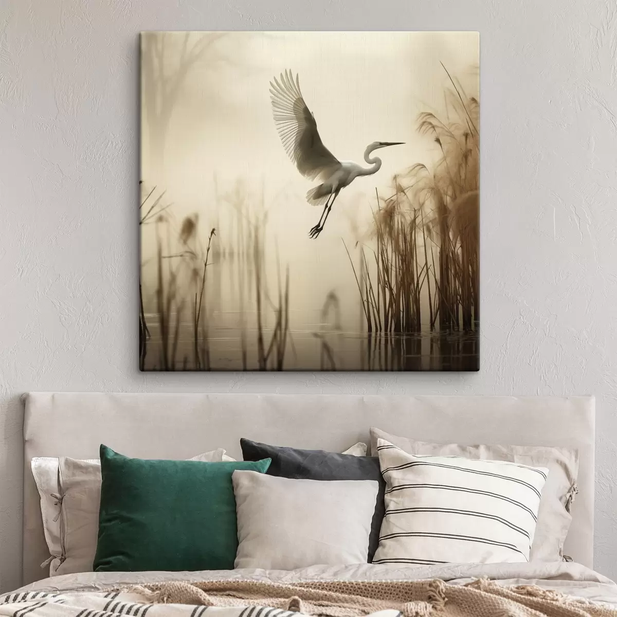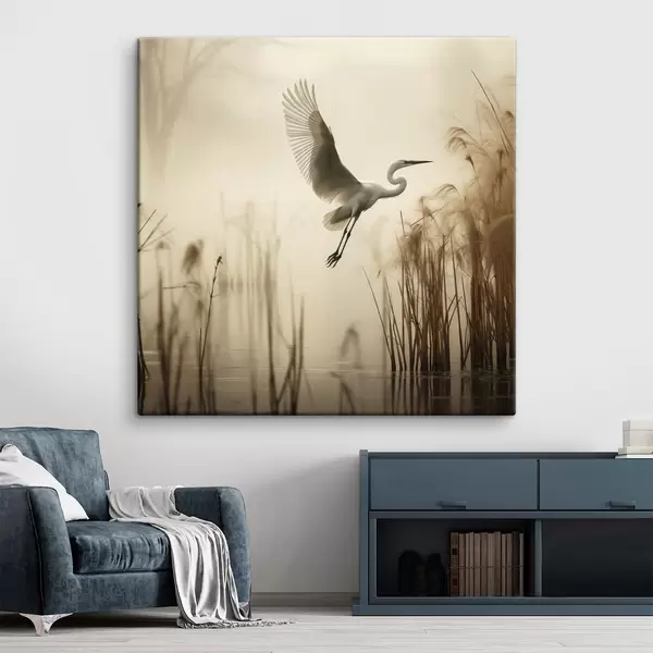 Obraz Nad jezerem, obklopeným vysokým rákosím a stromy v pozadí, letí bílá volavka Č. s48389
