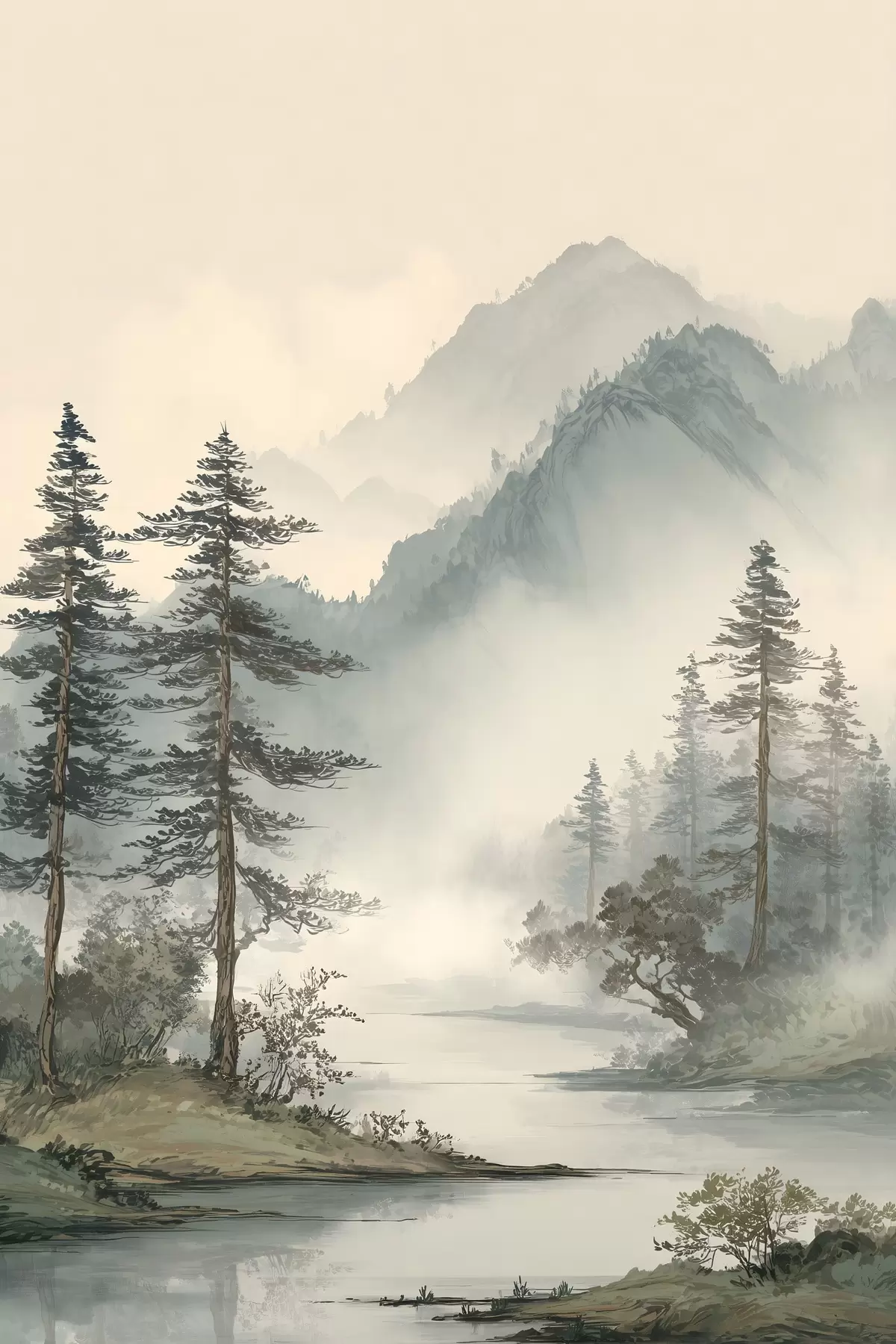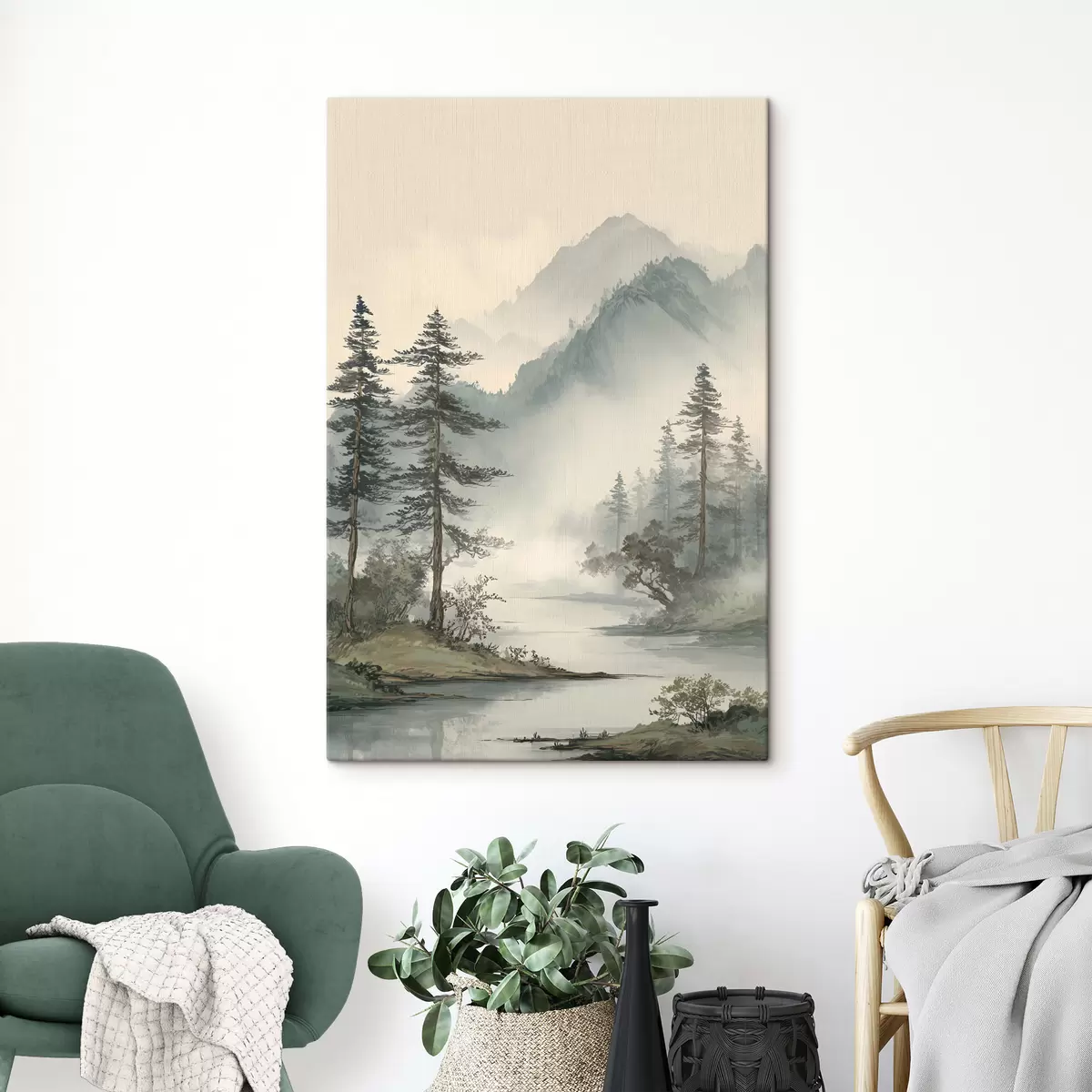 Obraz horská krajina s borovicemi a řekou Č. s48532