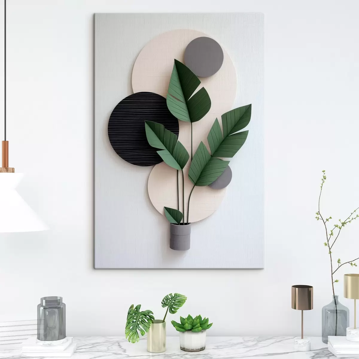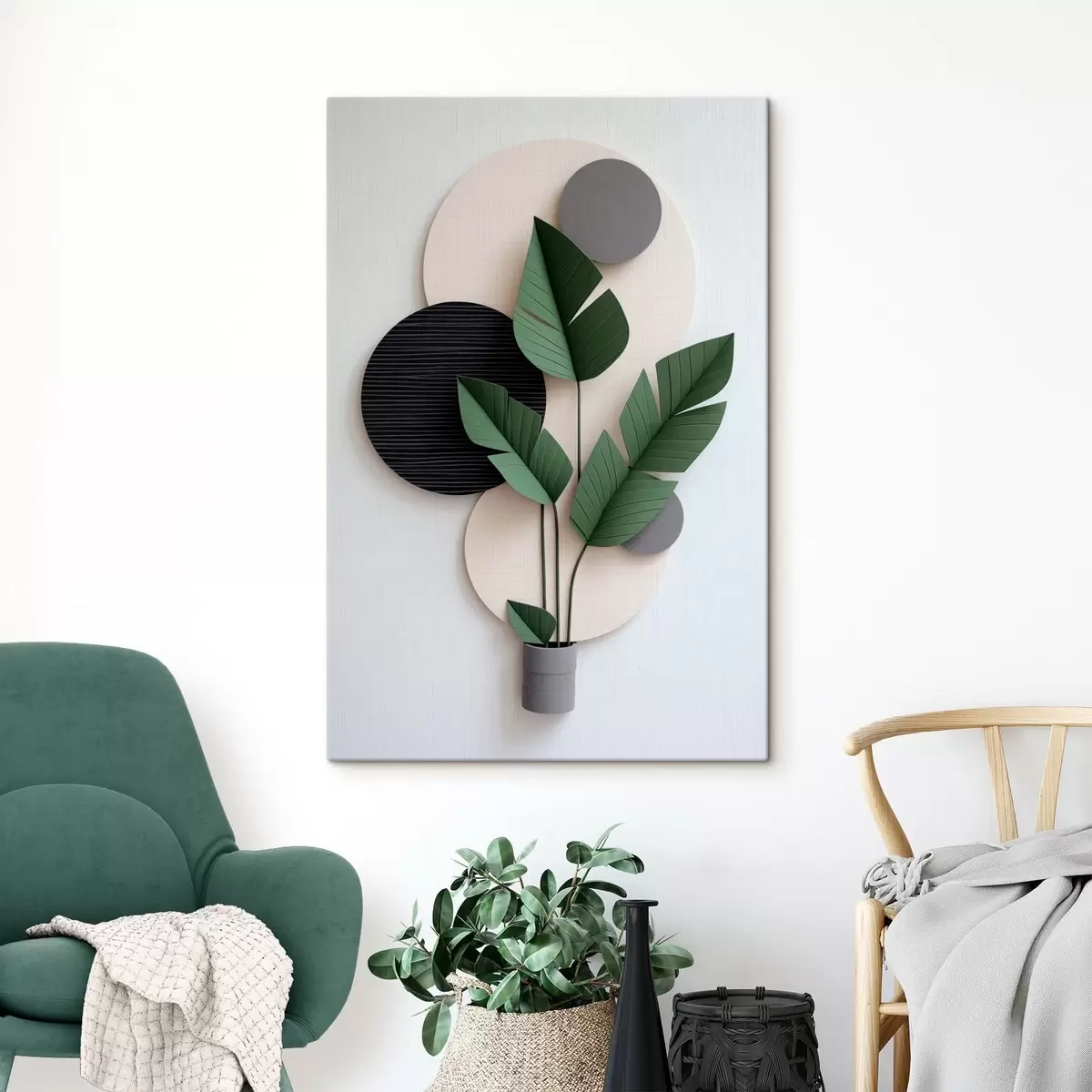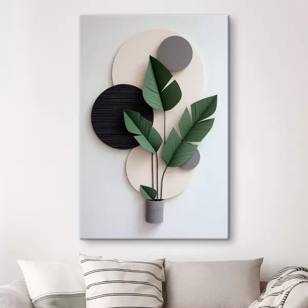 Obraz Minimalistické uspořádání s geometrickými kruhy a zelenými listy Č. s48607