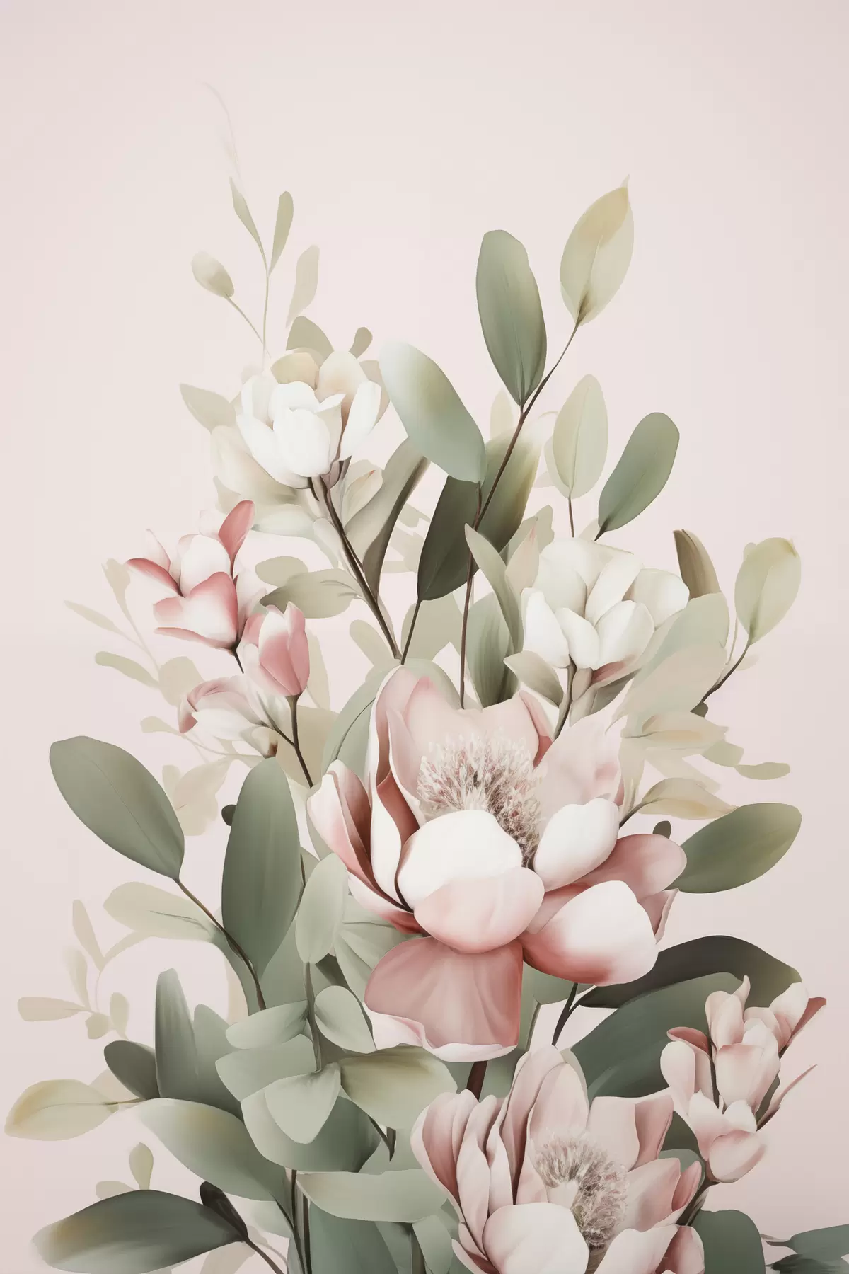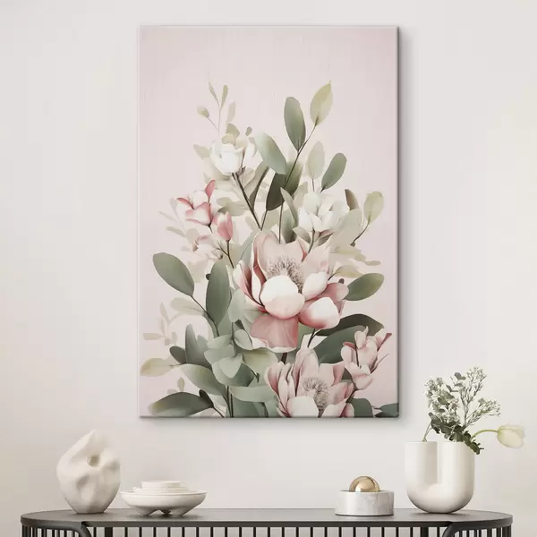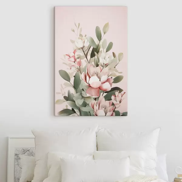 Obraz Kytice pastelových květin s eukalyptovými listy na světle růžovém pozadí Č. s48727