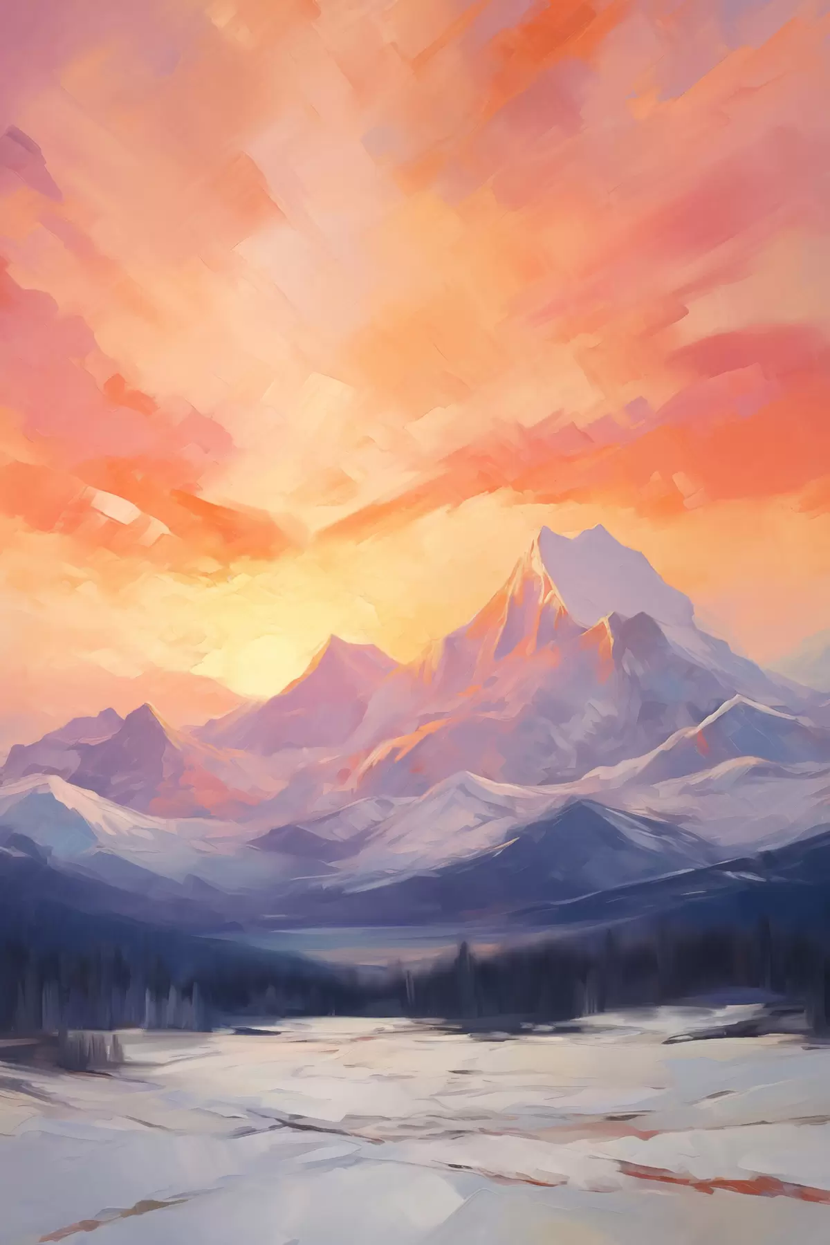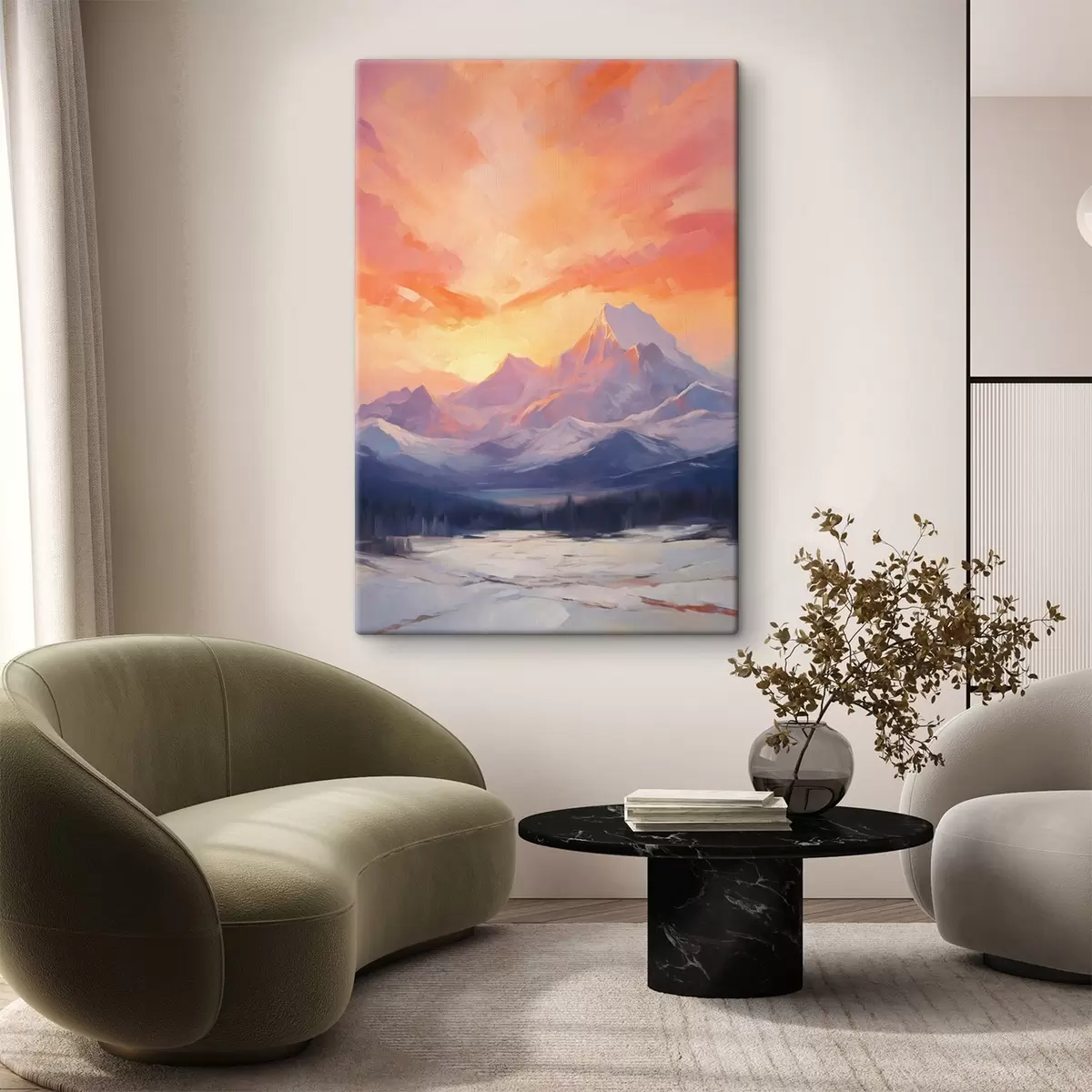 Obraz Zasněžené vrcholky hor pod zářivě oranžovou a růžovou oblohou s mraky Č. s48741