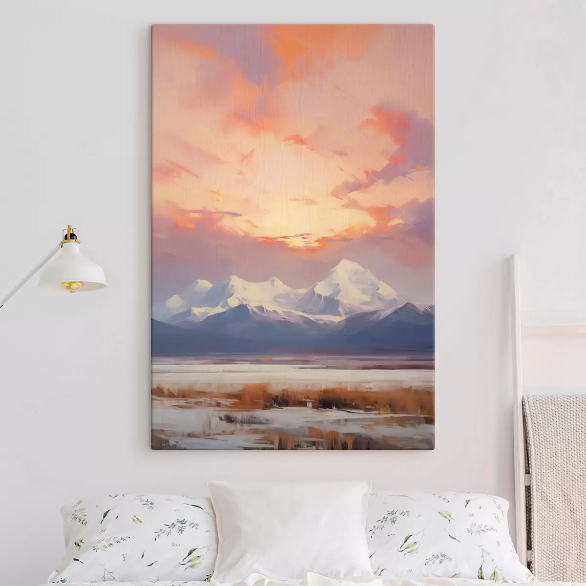 Obraz Zasněžené vrcholky hor pod zářivě oranžovou a růžovou oblohou s mraky Č. s48742