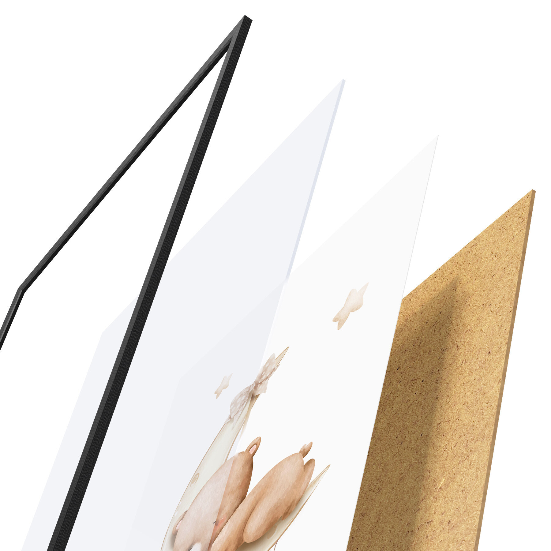 Plakát se skládá z rámu, plexiskla, tištěného obrazu a dřevotřískového podkladu. Díky úchytům na zadní straně lze plakát ihned zavěsit na zeď.