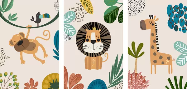 Poster Zvířata v džungli ve stylu safari, boho: opice, lev, žirafa Č. d00332