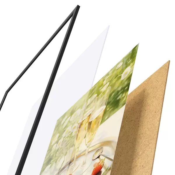 Plakát se skládá z rámu, plexiskla, tištěného obrazu a dřevotřískového podkladu. Díky úchytům na zadní straně lze plakát ihned zavěsit na zeď.