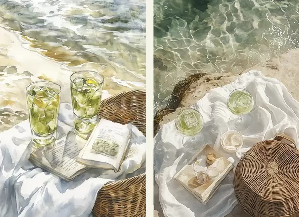 Poster Koktejly na pláži, kresba ve stylu akvarelu, oceán, letní piknik d00417