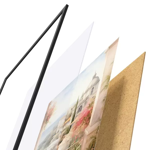 Plakát se skládá z rámu, plexiskla, tištěného obrazu a dřevotřískového podkladu. Díky úchytům na zadní straně lze plakát ihned zavěsit na zeď.