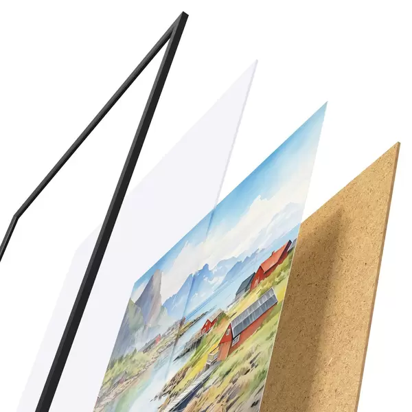Plakát se skládá z rámu, plexiskla, tištěného obrazu a dřevotřískového podkladu. Díky úchytům na zadní straně lze plakát ihned zavěsit na zeď.