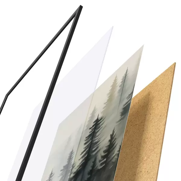 Plakát se skládá z rámu, plexiskla, tištěného obrazu a dřevotřískového podkladu. Díky úchytům na zadní straně lze plakát ihned zavěsit na zeď.
