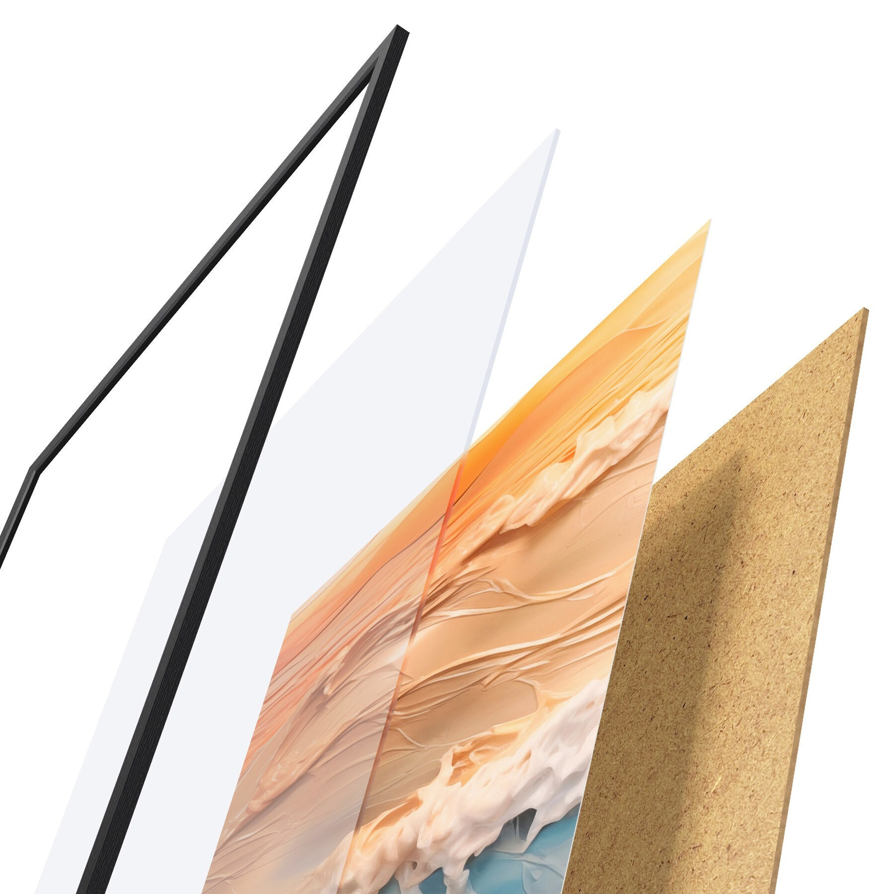 Plakát se skládá z rámu, plexiskla, tištěného obrazu a dřevotřískového podkladu. Díky úchytům na zadní straně lze plakát ihned zavěsit na zeď.