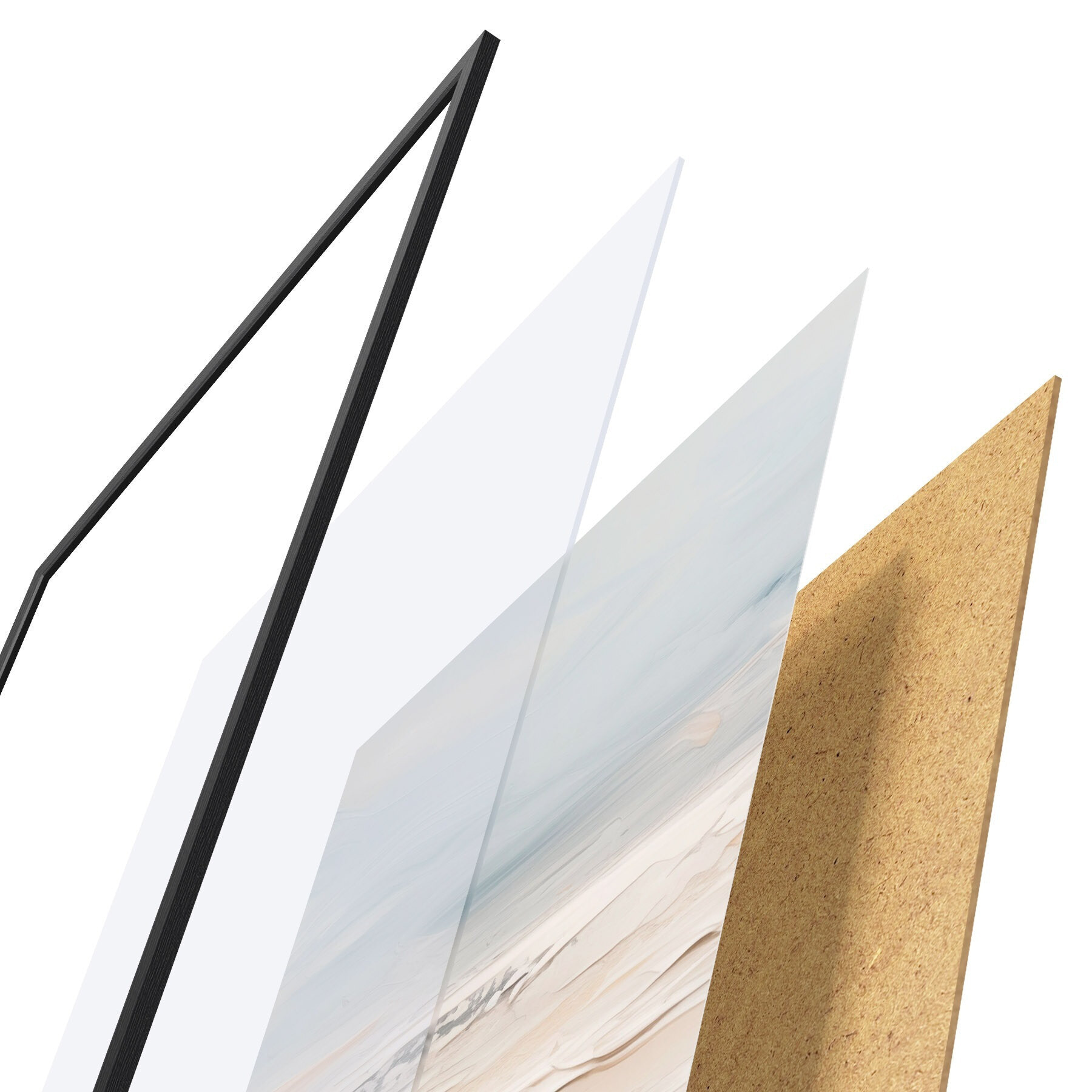 Plakát se skládá z rámu, plexiskla, tištěného obrazu a dřevotřískového podkladu. Díky úchytům na zadní straně lze plakát ihned zavěsit na zeď.