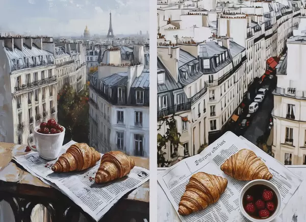 Poster Pohled na město na balkoně v Paříži, Eiffelova věž, jahody, káva, deník Č. d00445