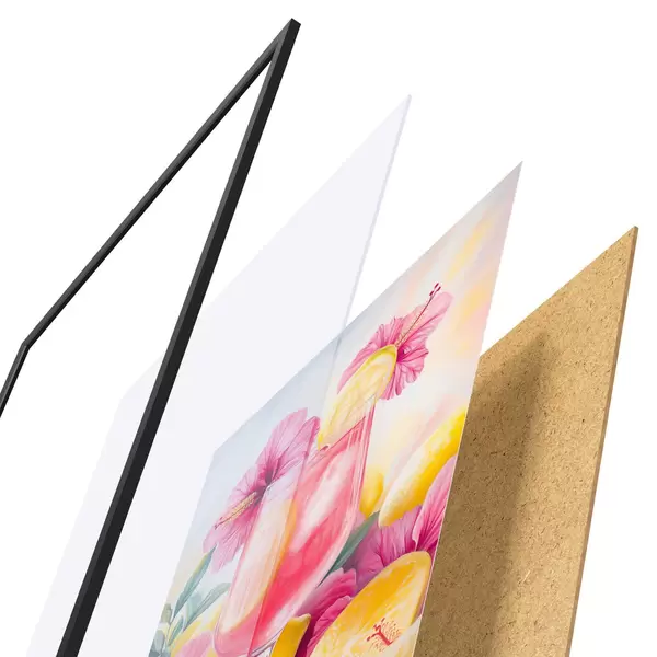 Plakát se skládá z rámu, plexiskla, tištěného obrazu a dřevotřískového podkladu. Díky úchytům na zadní straně lze plakát ihned zavěsit na zeď.