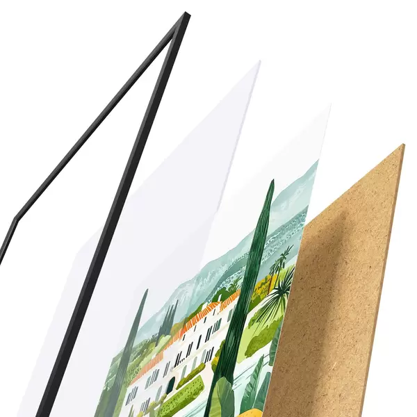 Plakát se skládá z rámu, plexiskla, tištěného obrazu a dřevotřískového podkladu. Díky úchytům na zadní straně lze plakát ihned zavěsit na zeď.