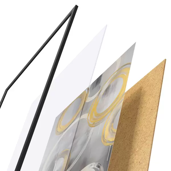 Plakát se skládá z rámu, plexiskla, tištěného obrazu a dřevotřískového podkladu. Díky úchytům na zadní straně lze plakát ihned zavěsit na zeď.