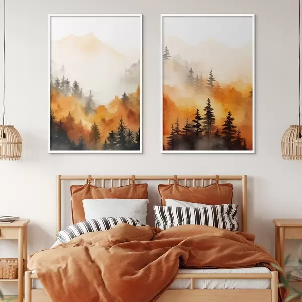 Poster Akvarelová malba krajiny imitující les s vysokými borovicemi a horami v pozadí Č. d00519