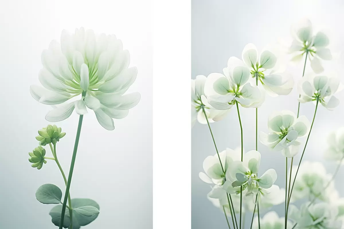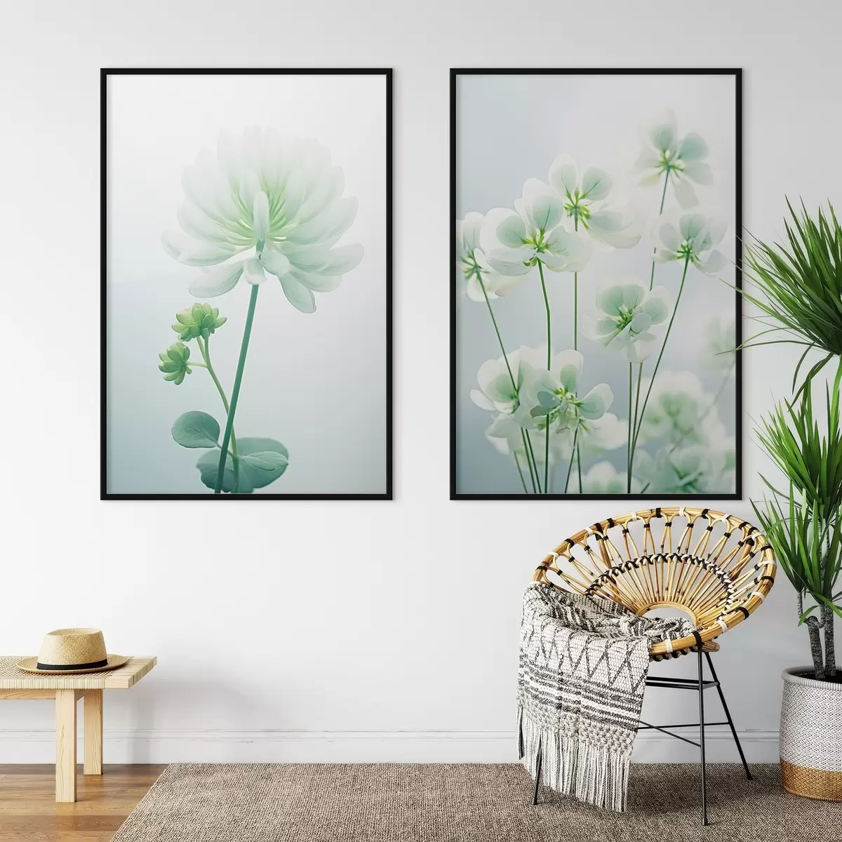 Poster Bílé jetelové květy se zeleným stonkem a listy, měkké osvětlení, čisté pozadí, minimalistická kompozice, botanické motivy Č. d00520