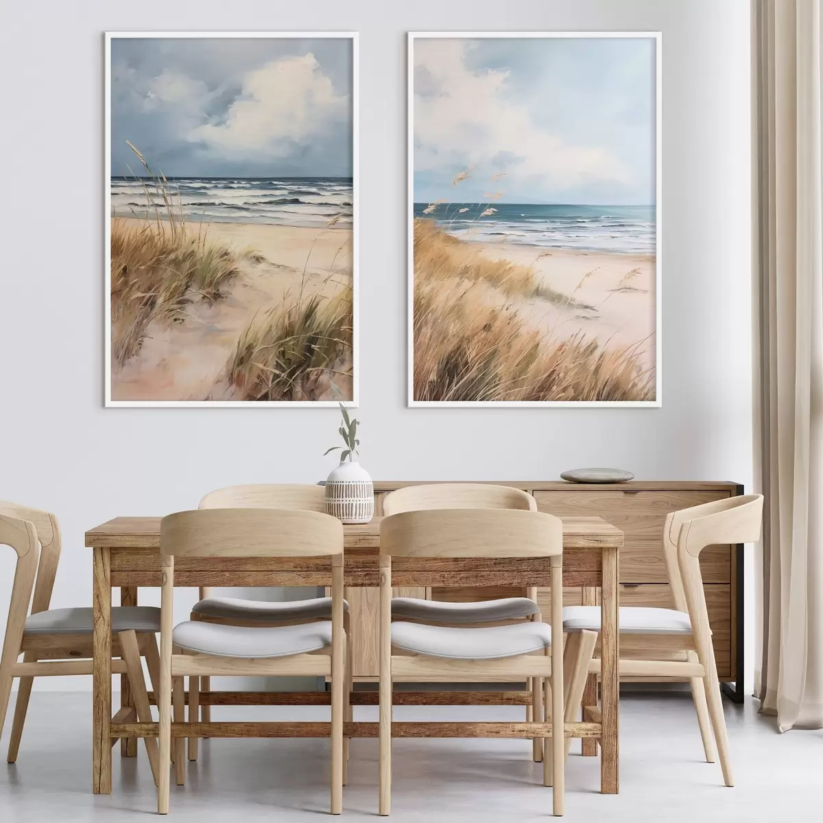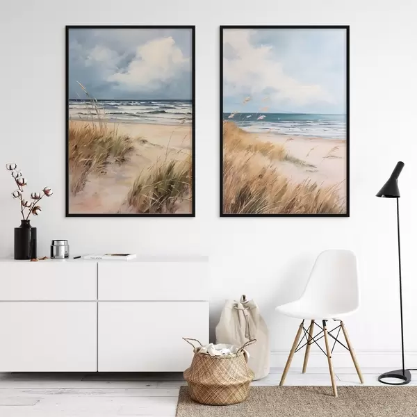 Poster Písečná pláž s vysokou trávou v popředí, oceán s vlnami a zataženou oblohou v pozadí Č. d00521