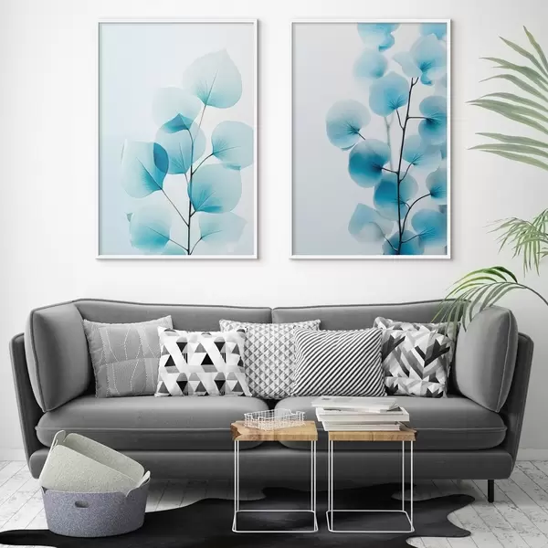 Poster Větev s průsvitnými modrými listy, viditelné jemné žilky, lehká a klidná kompozice, minimalistická estetika Č. d00522