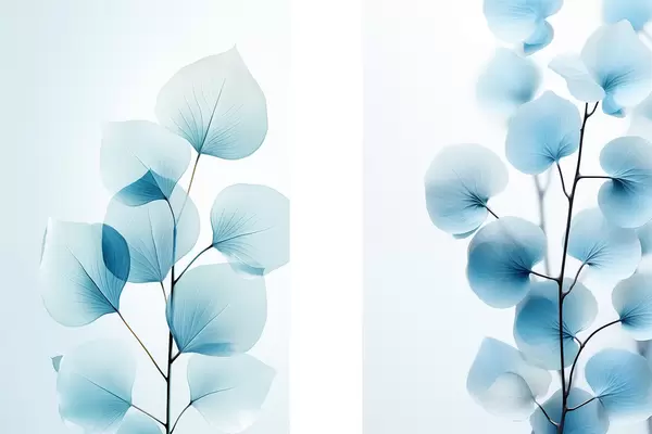 Poster Větev s průsvitnými modrými listy, viditelné jemné žilky, lehká a klidná kompozice, minimalistická estetika Č. d00522