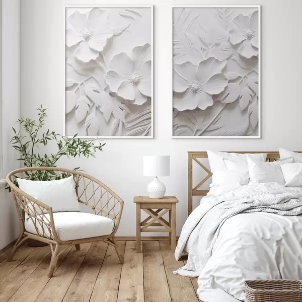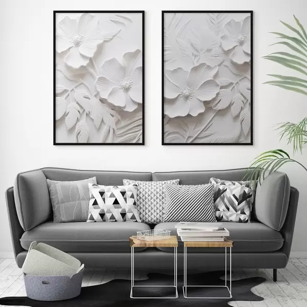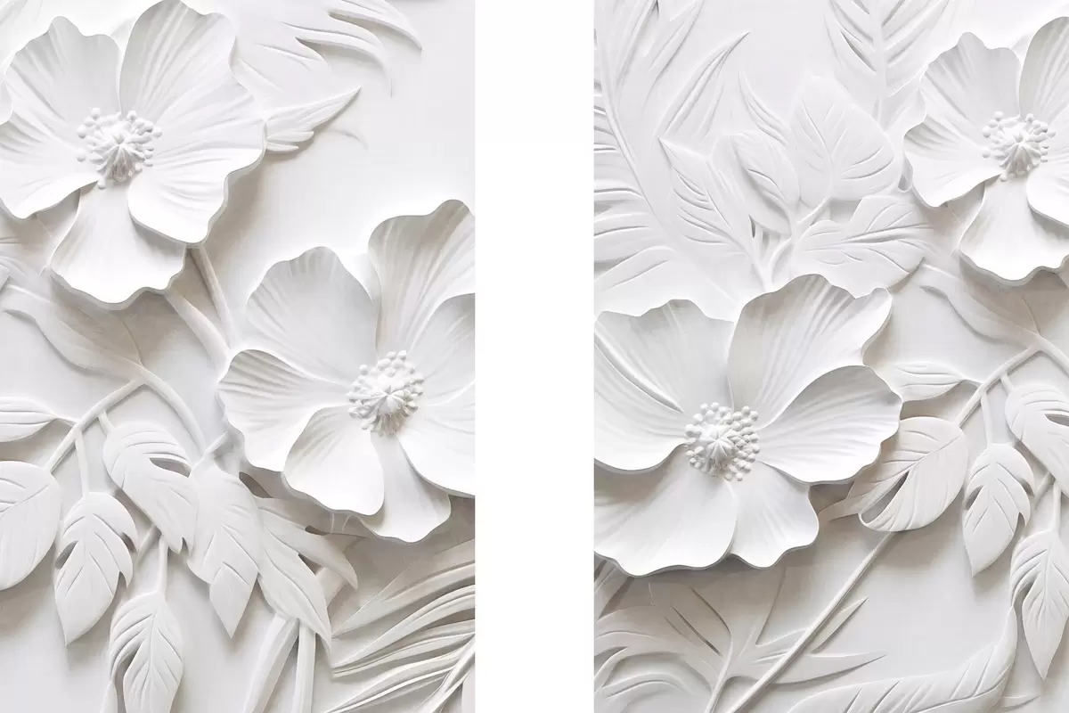 Poster Dekorativní minimalistické bílé květy s listy, imitace reliéfu, bílé pozadí Č. d00524