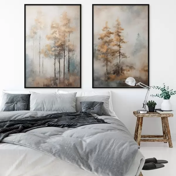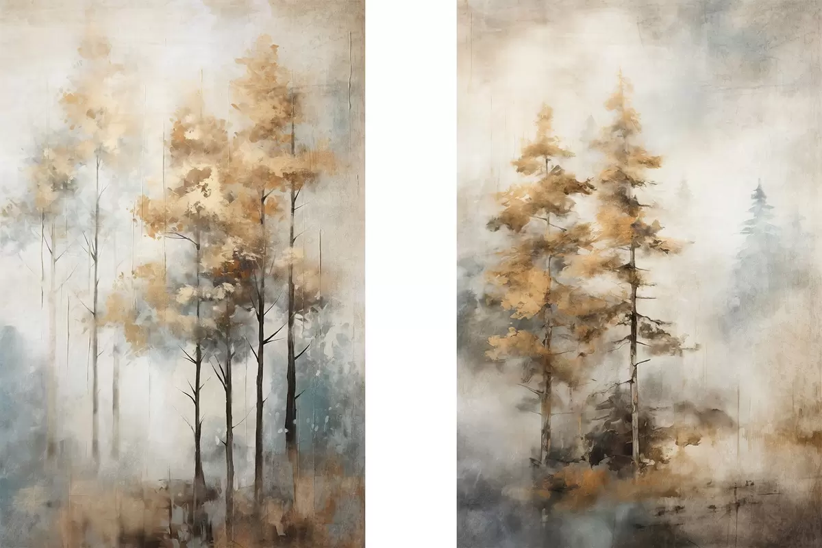 Poster Texturované vysoké stromy se žlutými listy v lese , pozadí je směs jemných modrých a hnědých tónů Č. d00528